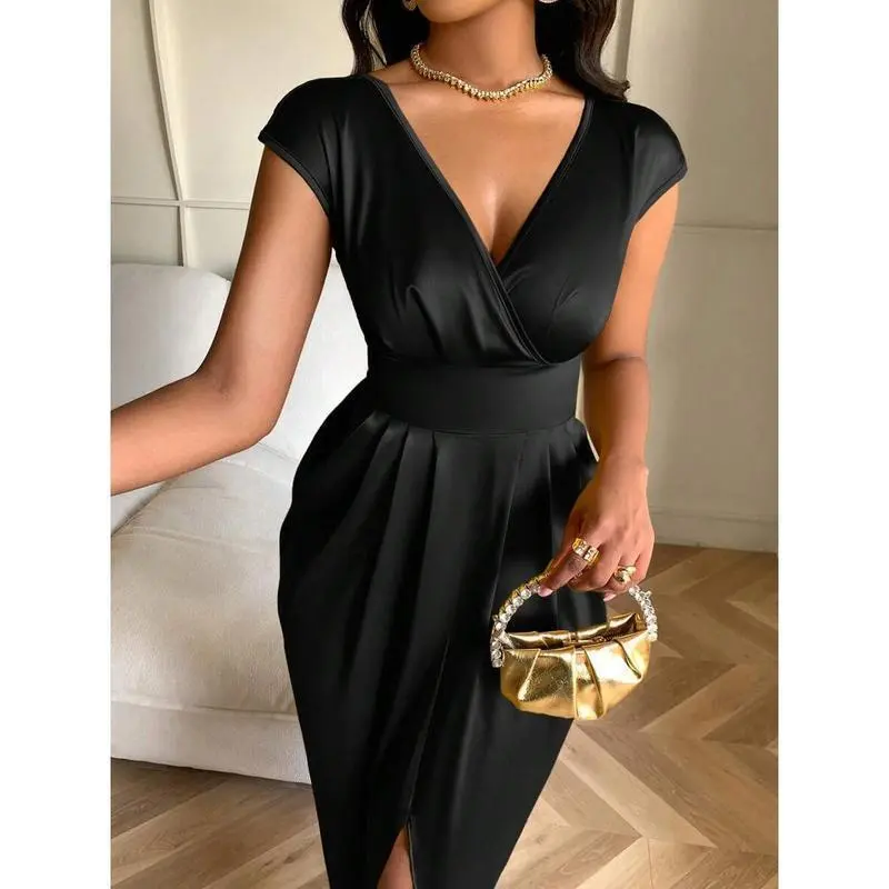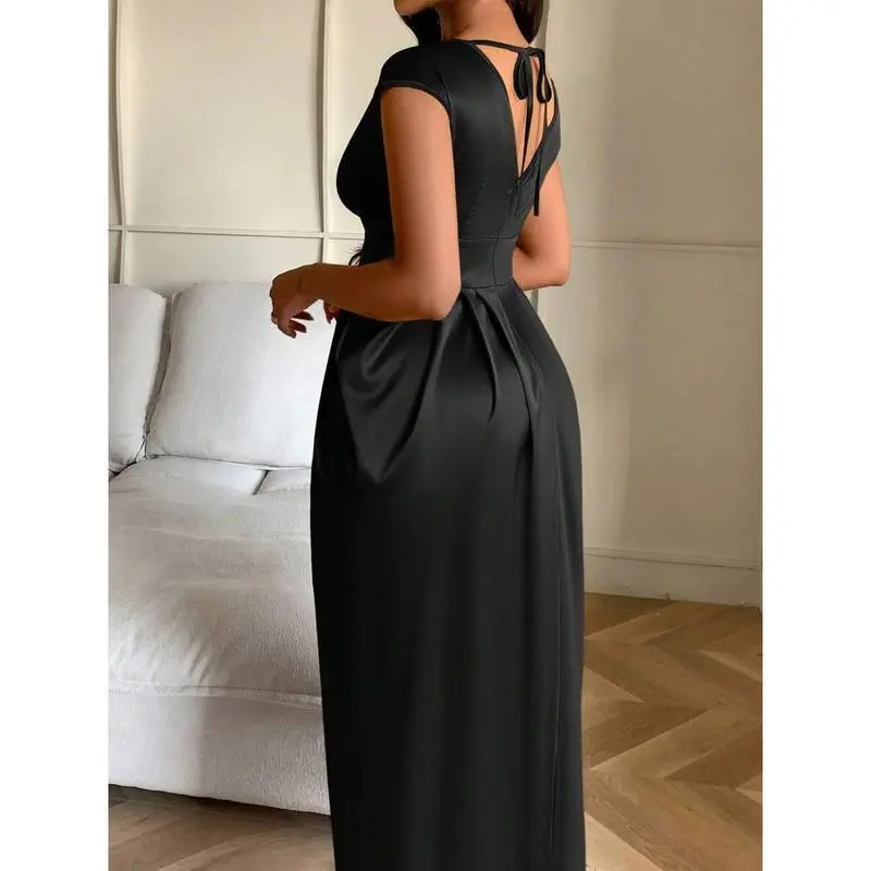 Neckline:V neck/Occasion:Night Out, Wedding, Formal & Evening/Sleeve Type:Batwing Sleeve/Hem Shaped:Wrap/Waist Line:High Waist/Type:Fitted/Details:Pocket, Wrap, Zipper/Lined For Added Warmth:No/Pattern Type:Plain/Style:Casual/Pockets:No/Body:No/Color:Black/Sleeve length: sleepveless/Fit Type:Regular Fit/Length:Long/Material:Fabric/Composition:97% Polyester, 3% Elastane/Care Instructions:Machine wash or professional dry clean/Sheer:No/Fabric Elasticity:Slight Stretch