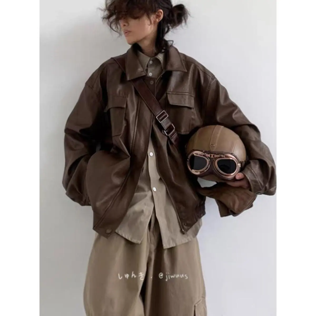 2025 Japanese retro and cool PU motorcycle leather jacket, loose neutral brown leather jacket Womenswear Coats flight jacket Tops Outerwear Long Sleeve Style Unisex Fashion