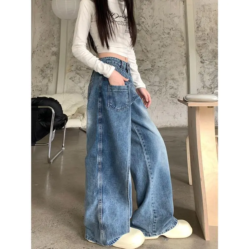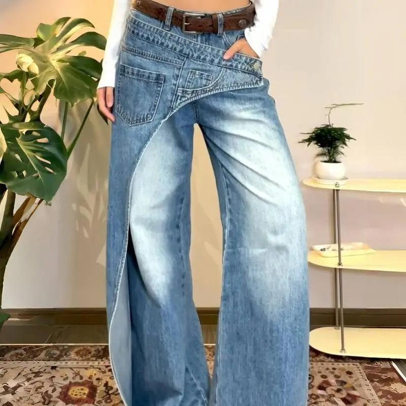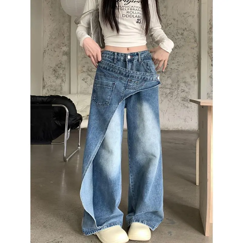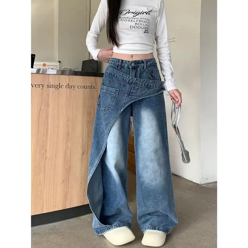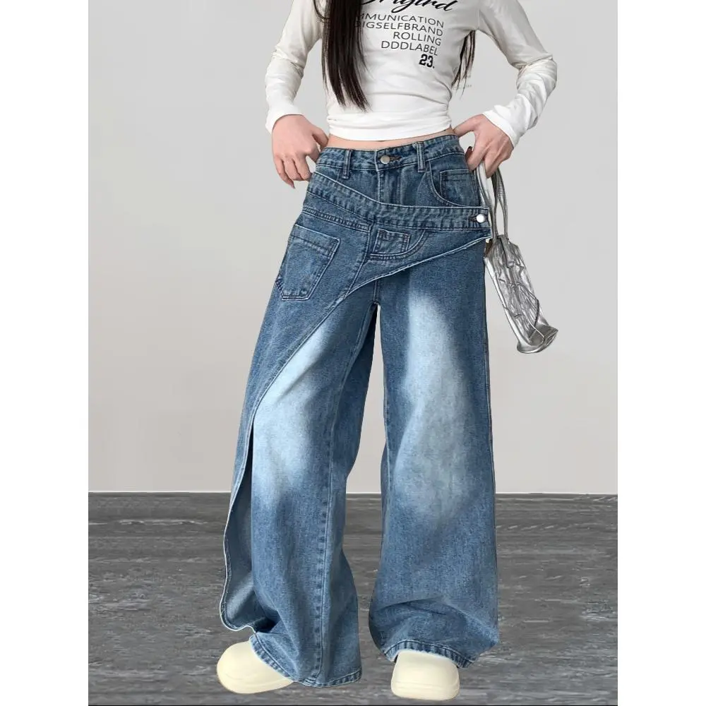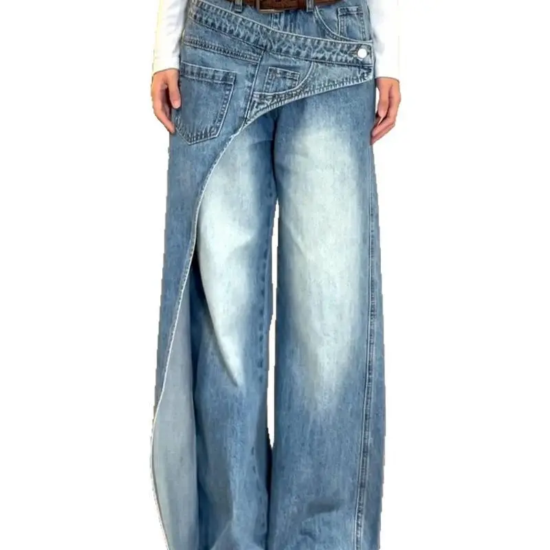 American-style washed deconstruction design jeans women's high street wide-leg pendant trousers
