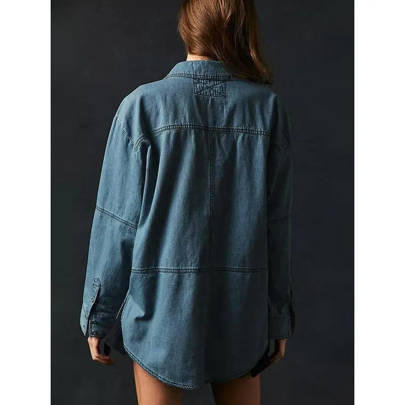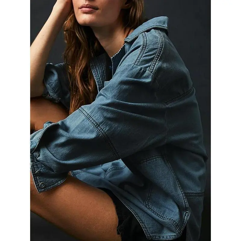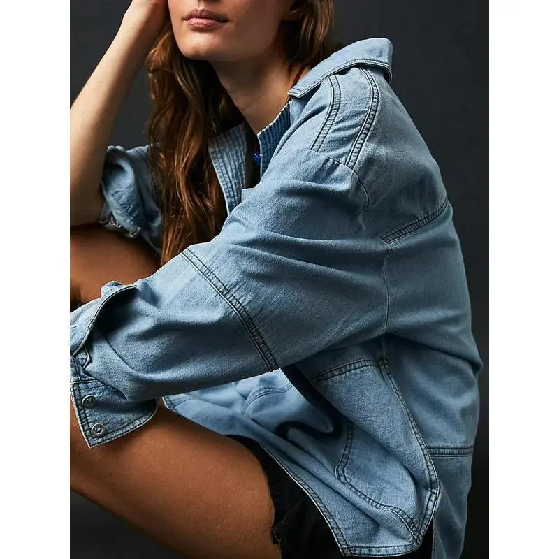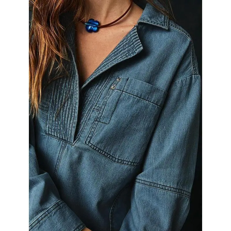 Women's Denim Pullover Casual Notch V Neck Blouse Loose Fit Long Sleeve Jean Jacket with Pocket Womenswear Button Plain Fitted All Seasons Chic Stylish