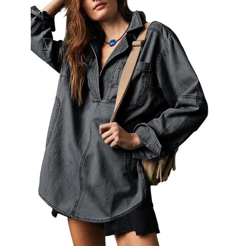 The following is the detailed introduction information of the product. Versatile Fashion: This women's denim pullover is a trendy yet practical addition to your wardrobe, perfect for a casual day out or a stylish evening look. Comfortable Fit: Designed with a loose fit and long sleeves, this blouse provides both comfort and style, allowing you to move freely while looking effortlessly chic. Functional Design: Our jean jacket features a button V neck and handy pockets, making it not only fashionable but also incredibly practical for carrying essentials. Premium Quality: Made from high-quality denim fabric, this blouse offers durability and long-lasting wear, ensuring it remains a staple piece in your wardrobe for years to come. Easy to Style: Pair this versatile denim jacket with jeans, skirts, or dresses for an effortless and on-trend look that will turn heads wherever you go.