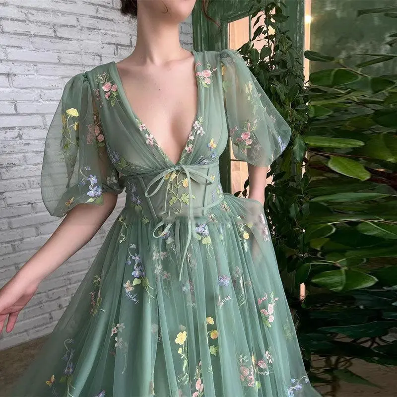 This exquisite dress boasts a flattering deep V - neckline that adds a touch of allure. The short, puff sleeves are crafted from sheer fabric, creating a dreamy and ethereal look. Delicate floral embroidery adorns the entire dress, giving it a romantic and vintage - inspired charm./Tied at the waist, it accentuates your figure beautifully. The flowing skirt creates a graceful silhouette. Ideal for garden weddings, spring - themed parties, or outdoor formal events, this dress will make you feel like a fairy - like presence, exuding elegance and femininity.