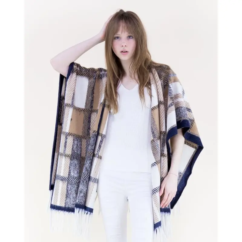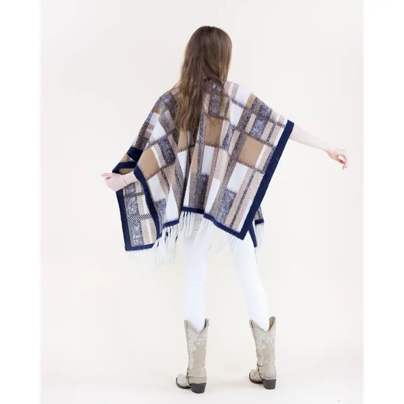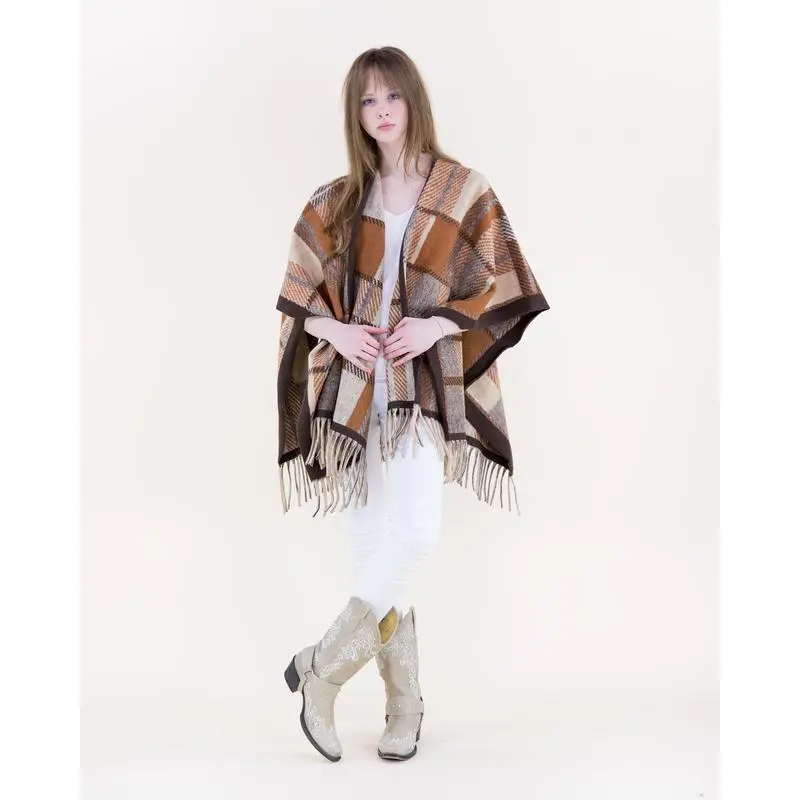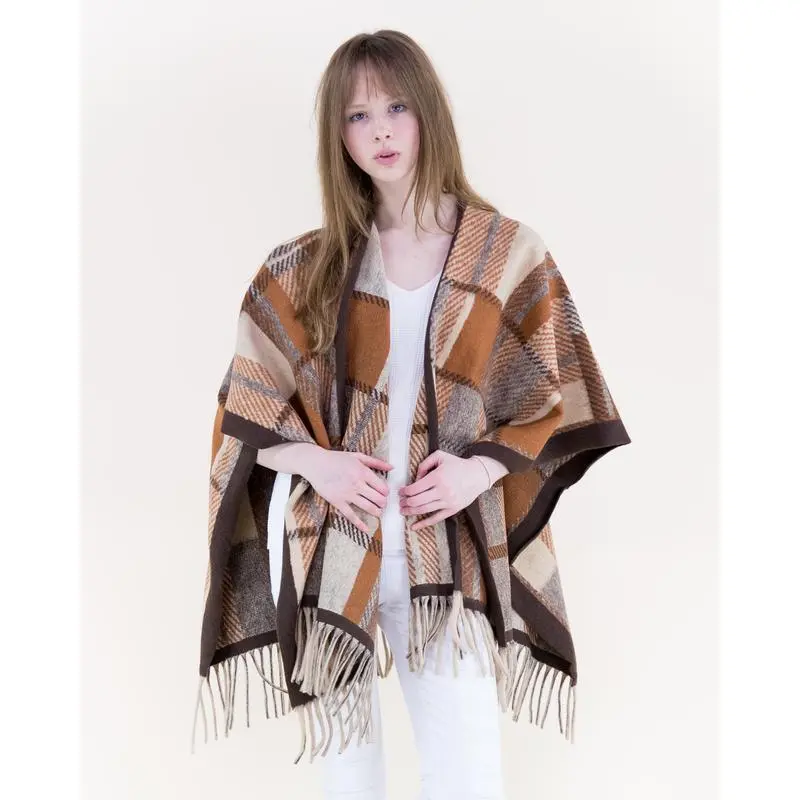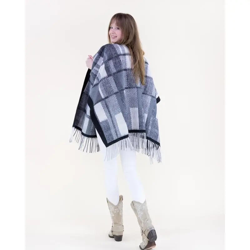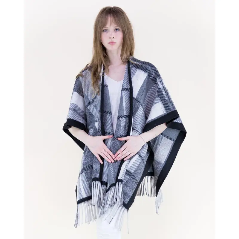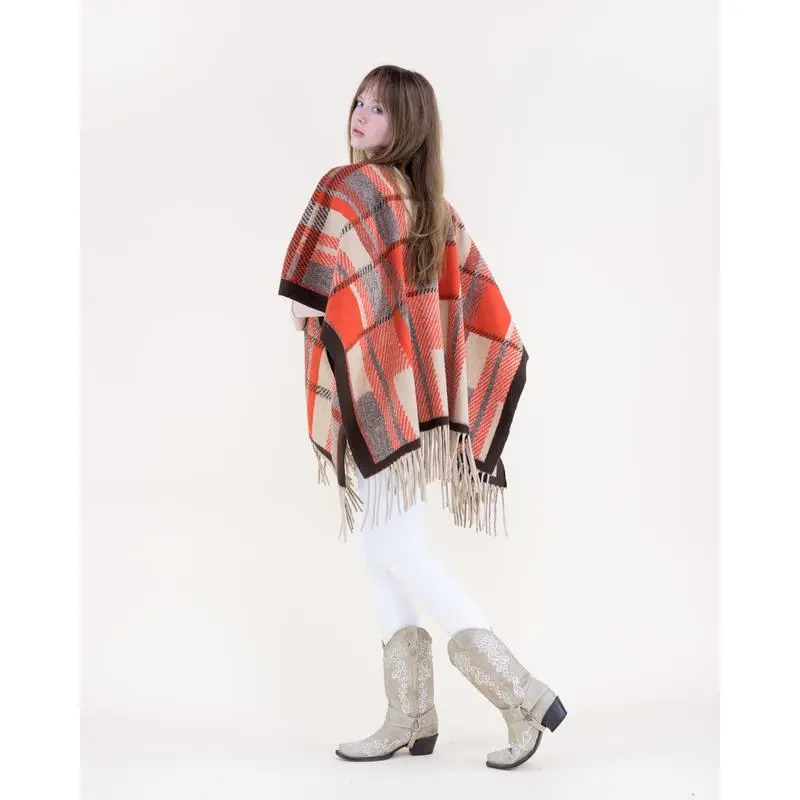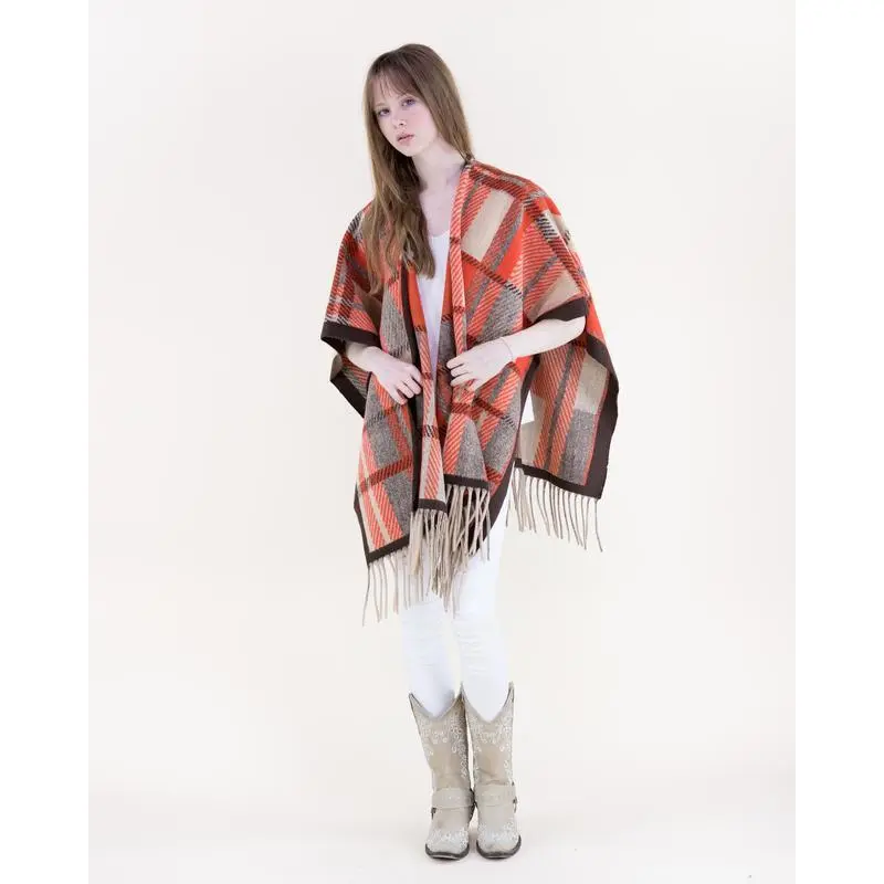 Wrap yourself in warmth and style with this Plaid Fringed Shawl Poncho. Designed with a cozy plaid pattern and soft woven texture, this open-front wrap drapes effortlessly over any outfit. The relaxed fit and tassel fringe add movement and charm, making it perfect for layering over jeans, boots, or dresses during cool weather. Available in Black, Khaki, Camel, and Rust Orange – a must-have for fall and winter seasons.