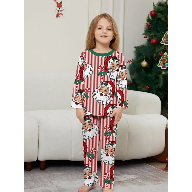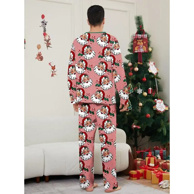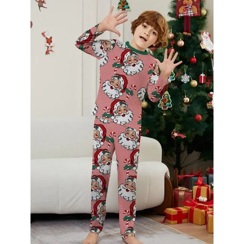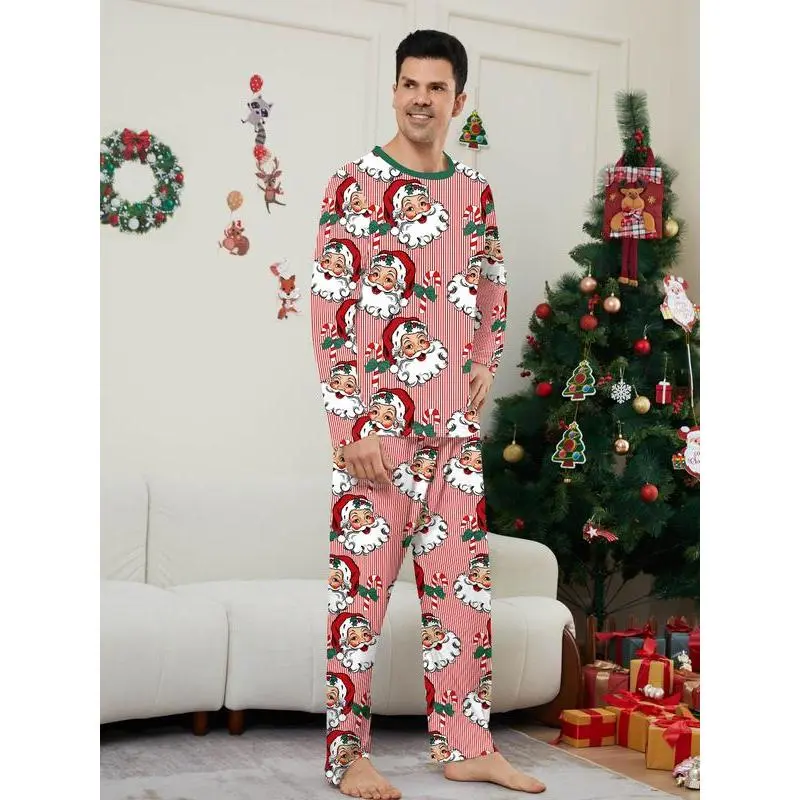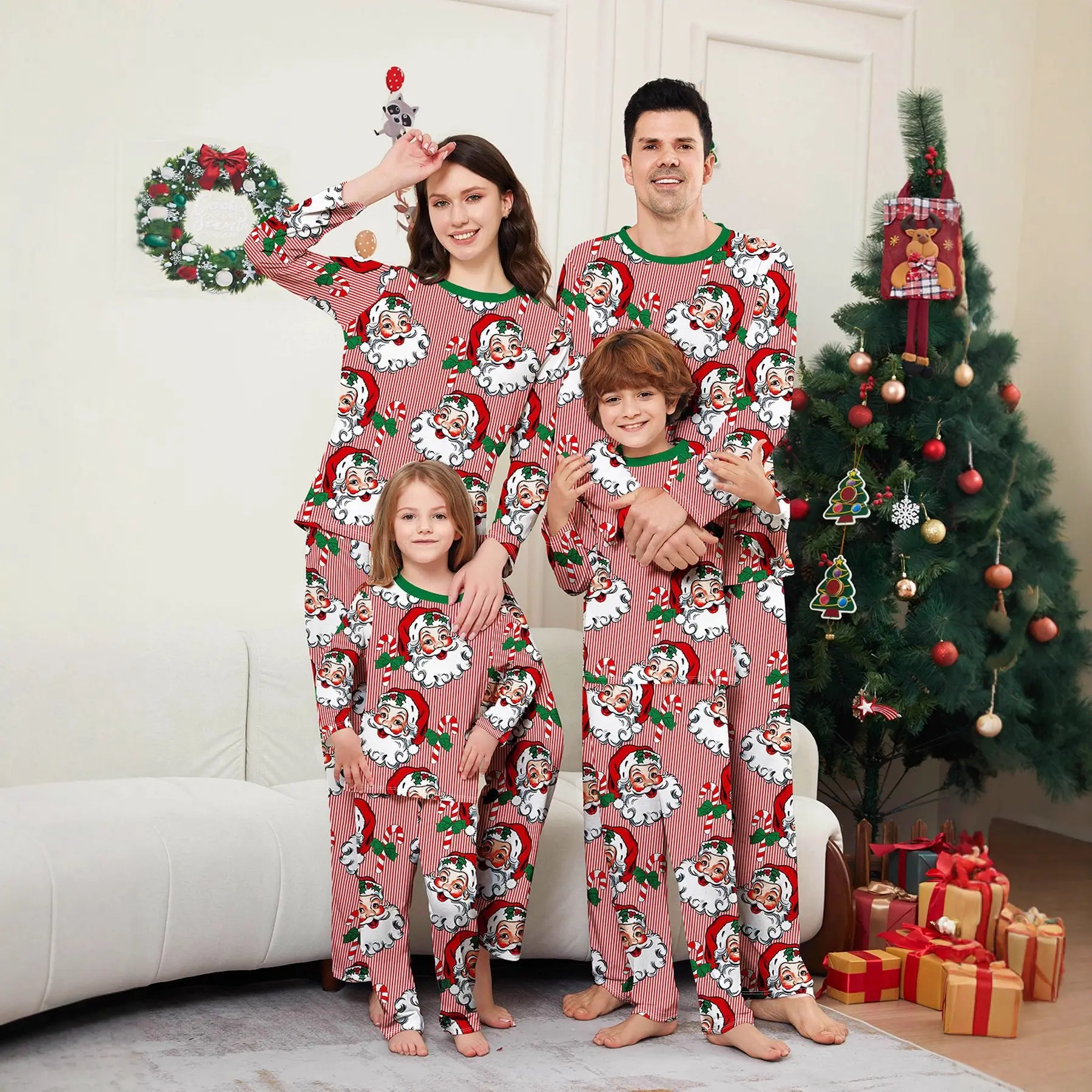 Family Christmas Pajamas Set, Santa Claus Striped Print, Casual Fall Winter Home Wear, Long Sleeve Fitted Sleepwear, 2 Piece Kit