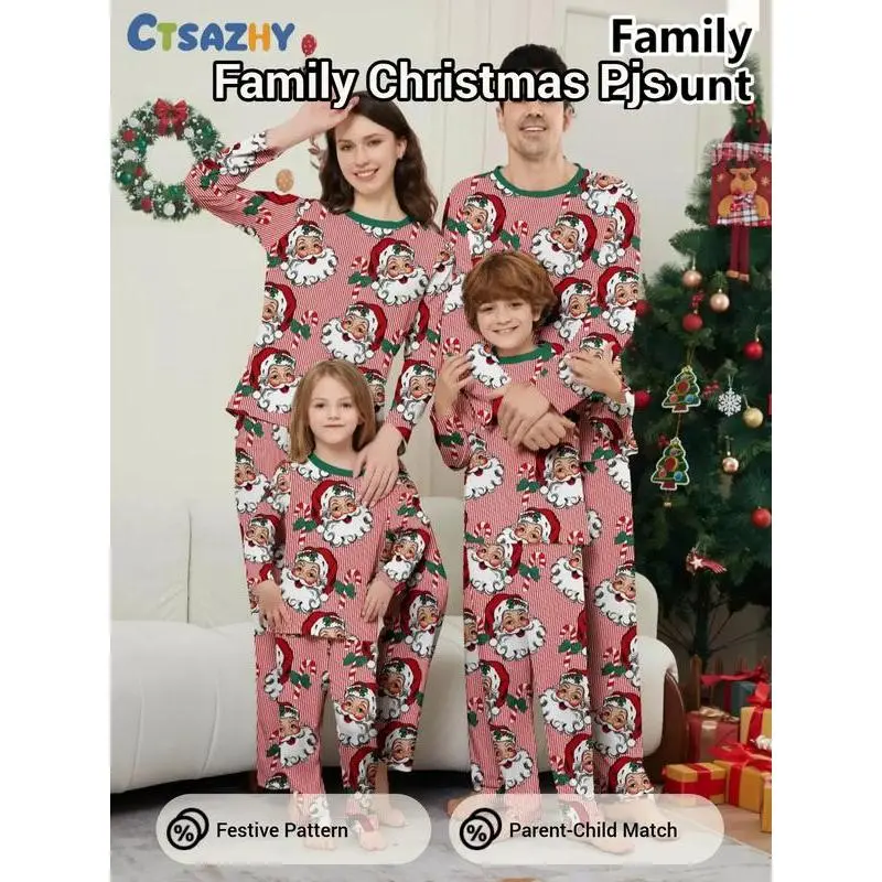 ��Festive Patterning��: Featuring a unique Christmas-themed Santa Claus striped print, this sleepwear set brings holiday cheer into your home. ��Parent-Child Matching��: This two-piece pajama set is designed for both parents and kids to enjoy matching looks during the festive season. ��Seasonal Fabric��: Made from thin knitted fabric, it's suitable for autumn and winter, offering warmth without bulk. ��Long Sleeve Coverage��: Designed with long sleeves to provide ample warmth during cold nights, making it a cozy choice for family gatherings. ��Fitted Cut��: The fitted fit ensures a tailored look while allowing for easy movement, making it suitable for lounging around.