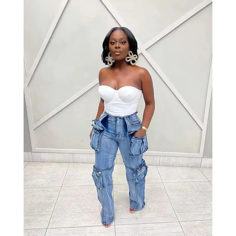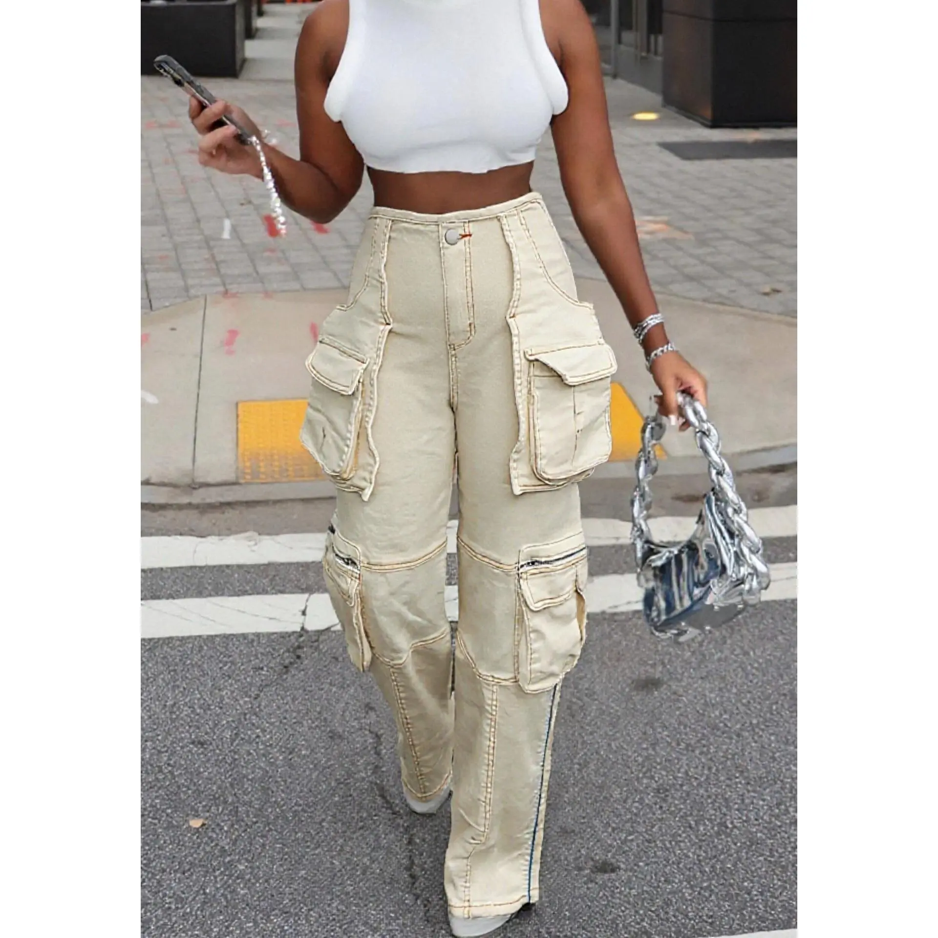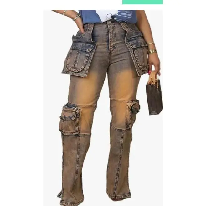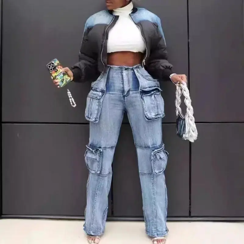 VintageWashedDistressedWomenJeansAnkleLengthSplicedCargoPantsDenimPocketsHighWaistStreetwearLooseFit2024WomenswearBottomTrouser
