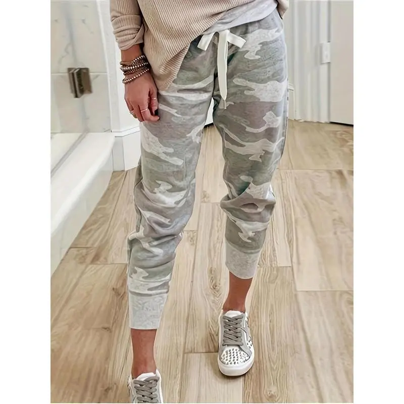 Camouflage Print Fitted Bottom Jogger Pants, Casual High Drawstring Waist Cropped Pants, Women's Clothing