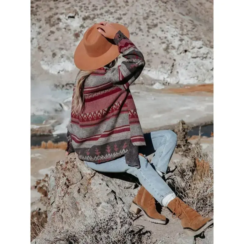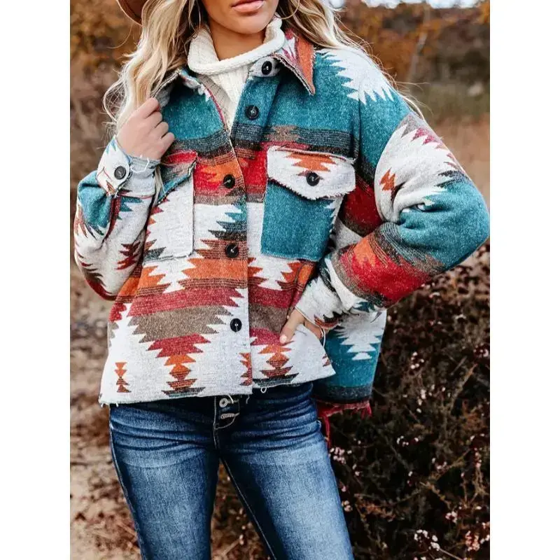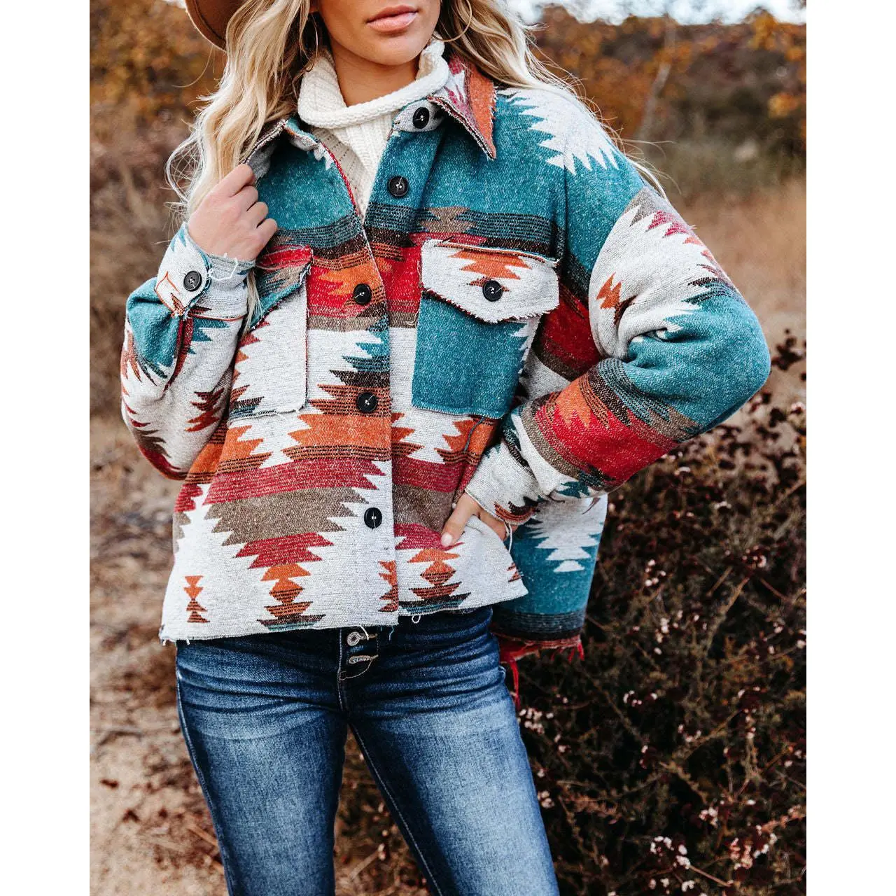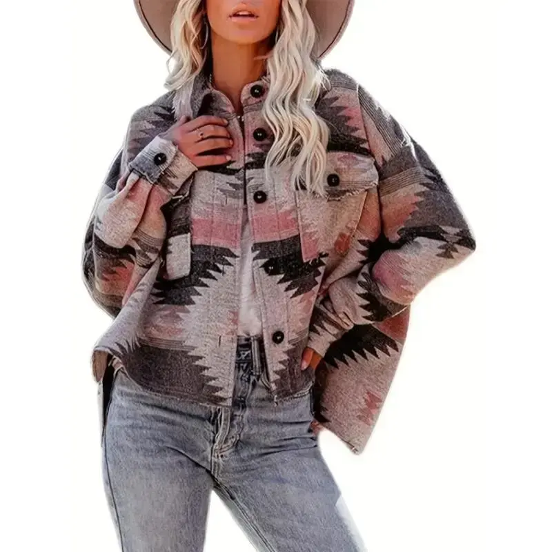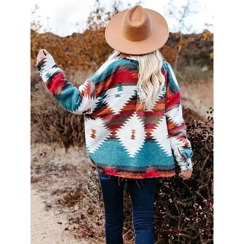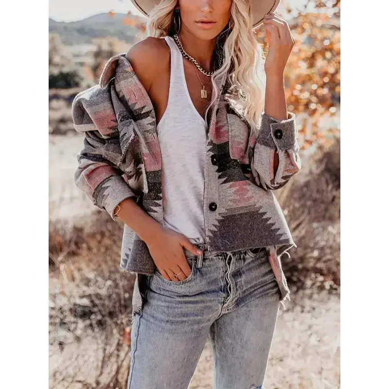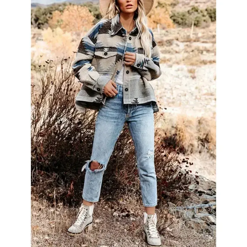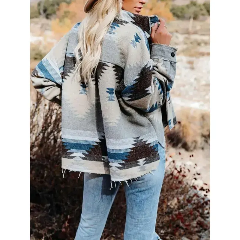 Women's Aztec Style Shirt Jacket With Button Design, Bohemian Western Vintage Distressed