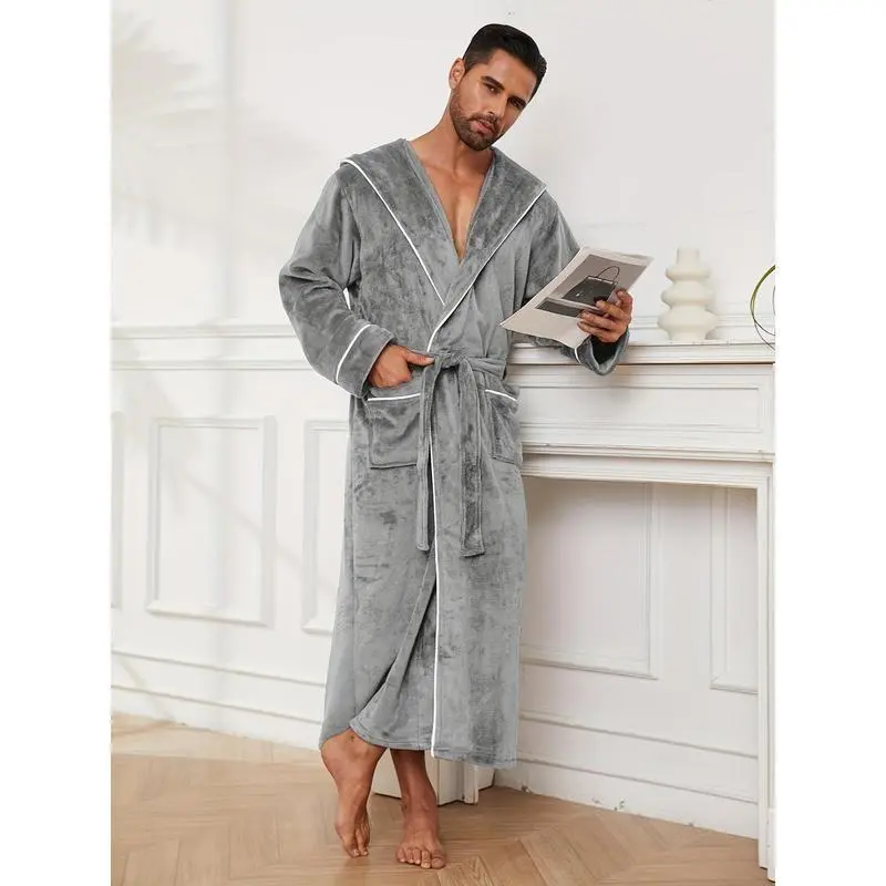 1pc Luxurious Plush Fleece Bathrobe - Cozy Thick Double-Layer Hooded Lounge Wear with Pockets, Machine Washable, Ideal for Autumn/Winter Comfort Long Sleeve Fashion Men's Cotton Flannel Robe Loungewear Menswear Nightwear Beige Casual Navy Blue Navy Blue