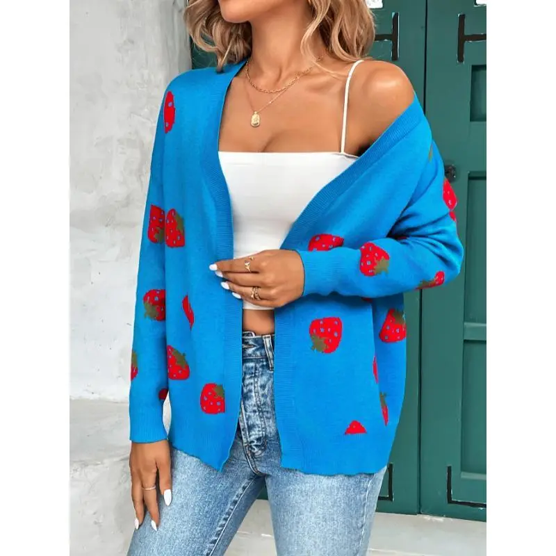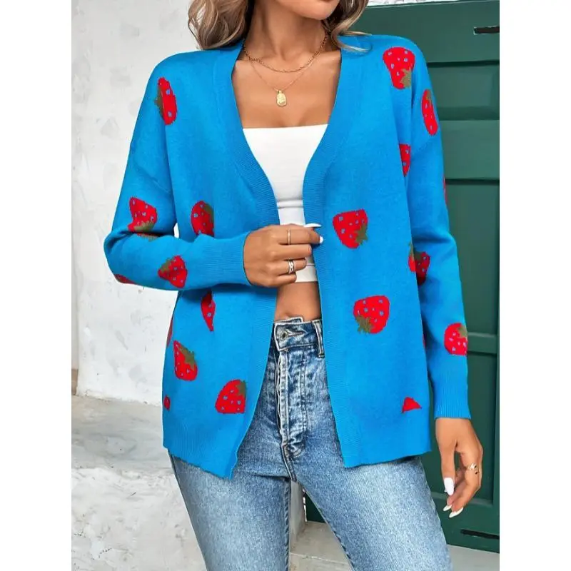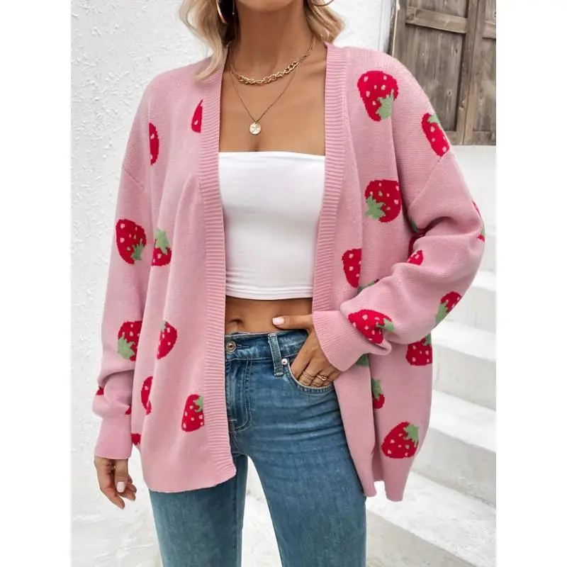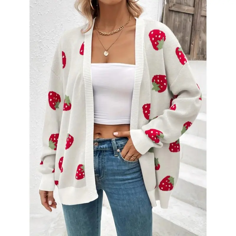 Strawberry Pattern Open Front Cardigan, Elegant Long Sleeve Cardigan For Spring & Fall, Women's Clothing Collar Fabric Tops Casual