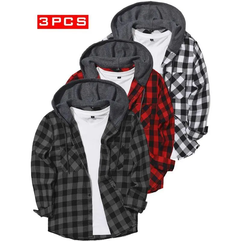 3-Pack Men's Flannel Hoodie Shirts - Plaid Button- Long Sleeve Casual Jackets with Pockets, Machine Washable, All-Season Comfort (Grey/Red & Blue/Black Checkered), Fall Wardrobe Essentials, Classic Plaid Design, Front Pocket Feature Menswear Polyester