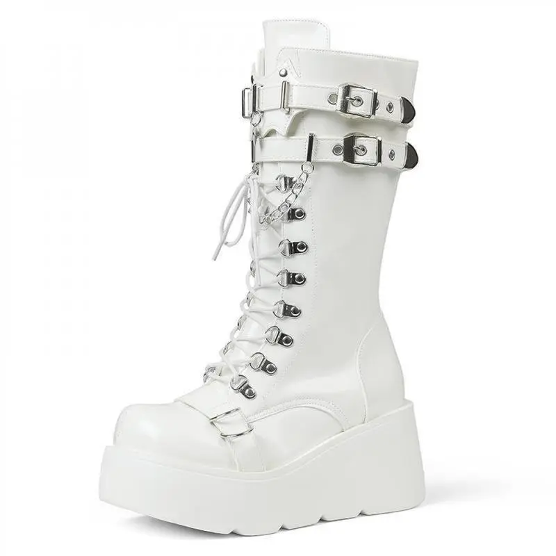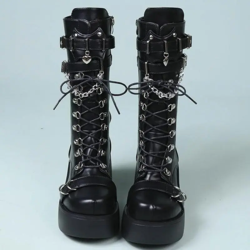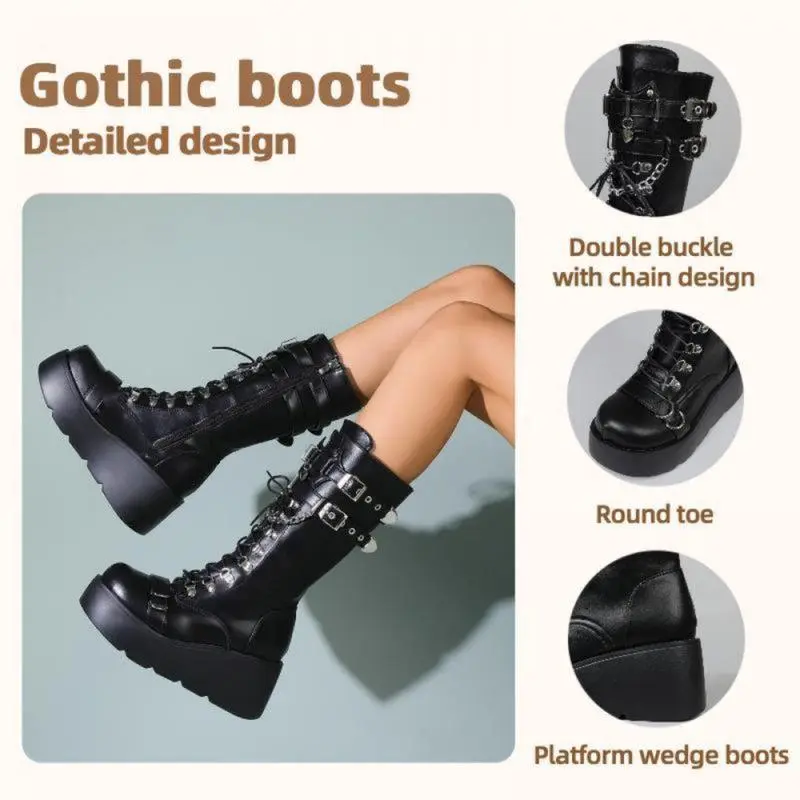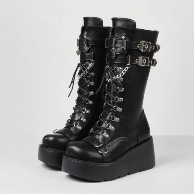 Baby who come across this product have hidden benefits. Come and consult me now Women's gothic knee high boots blend edgy punk style with practical design, featuring a wedge platform that adds height while ensuring stable support.The mid calf to knee high length brings a bold silhouette, complemented by a round toe that balances the boots' striking look with everyday comfort. Equipped with a side zip for easy on and off, these boots also include lace up details that enhance their punk aesthetic, allowing for a customized fit.As tall punk combat boots, they combine durability with a comfortable feel, making them suitable for all-day wear. Whether paired with skinny jeans, skirts, or dresses, these gothic boots add a distinctive edge to any outfit. The combination of wedge platform, round toe, side zip, and lace up elements ensures they stay true to punk style while remaining versatile. Perfect for those who love bold, alternative fashion, these boots stand out as a statement piece in any footwear collection.