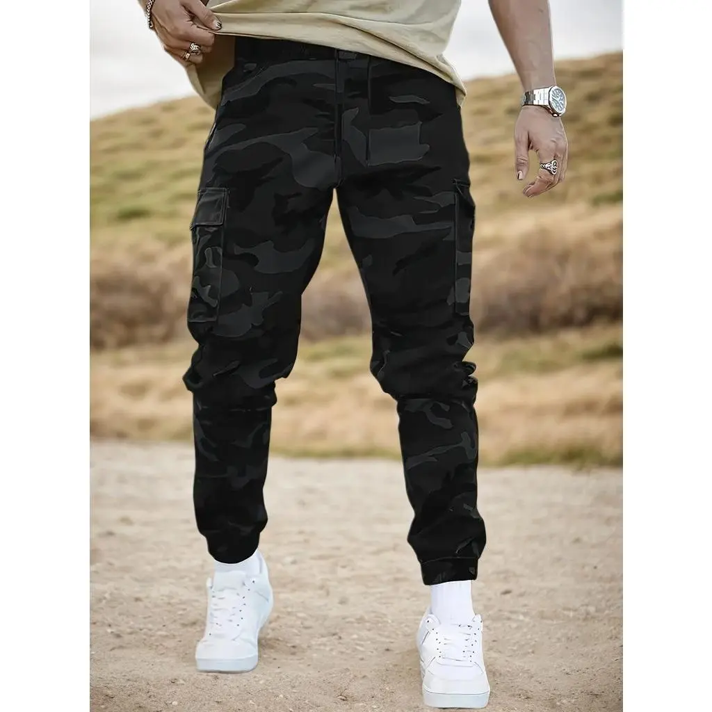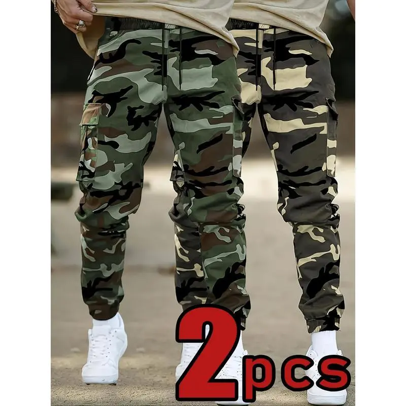 2-Pack Camo Cargo Pants, Casual Polyester Joggers with Drawstring Waist, Multiple Pockets, and Cuffed Ankle, Non-Stretch Woven Fabric, Regular Fit