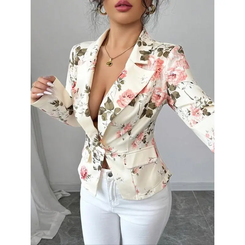 Elegant Floral Print Women's Blazer Jacket, Short Sleeve X-Cut Design with Pockets, All-Season Wear