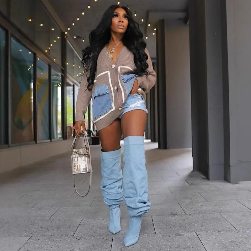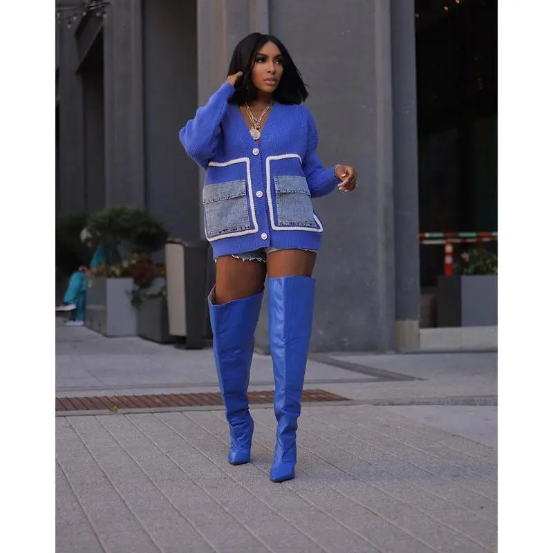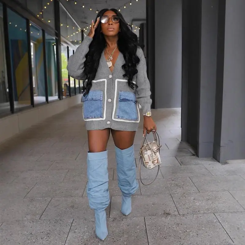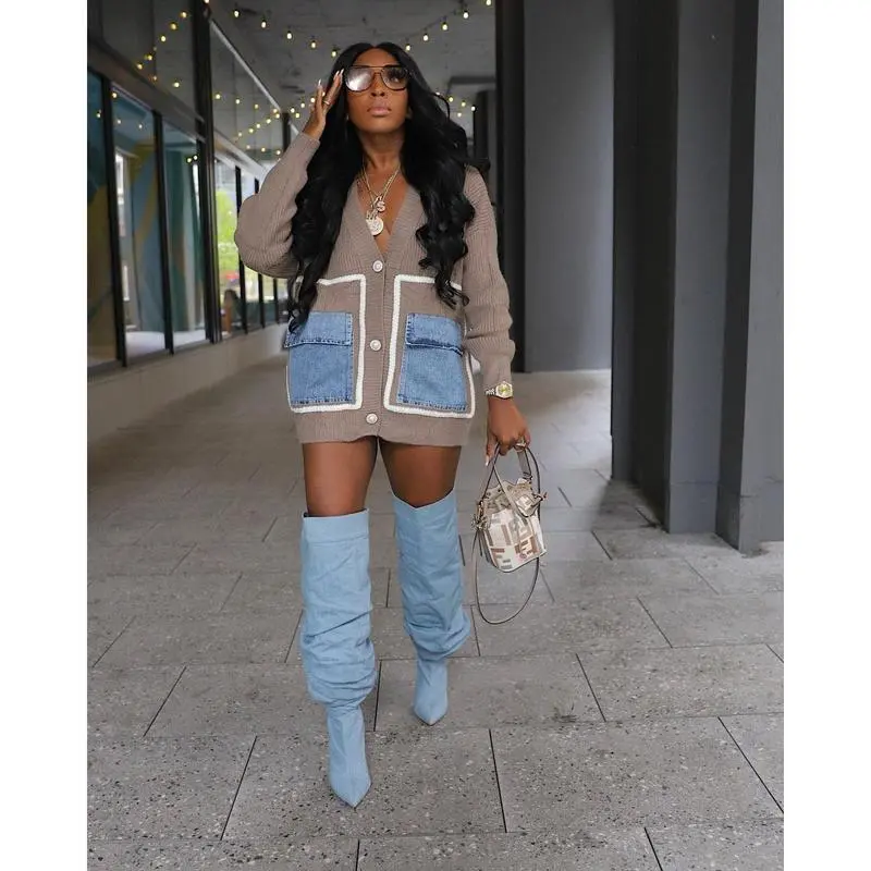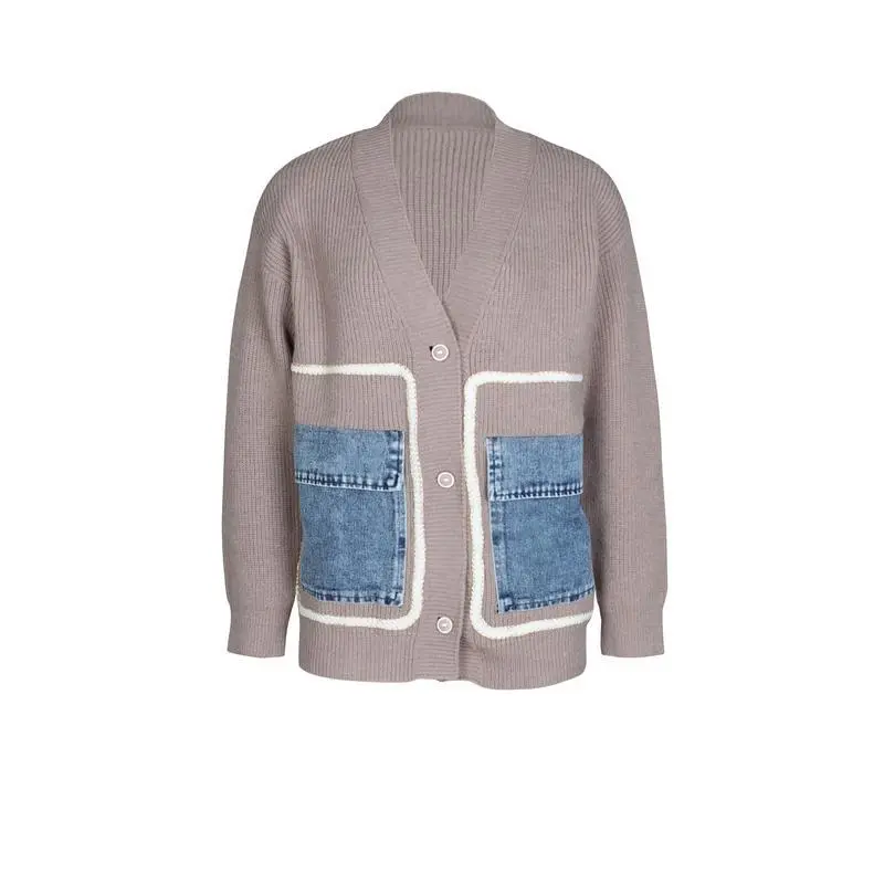 Women's Patchwork Button Front Sweater Cardigan, Casual Deep V Neck Long Sleeve Pocket Cardigan, Ladies Spring & Fall Knitwear, Cardigans for Women