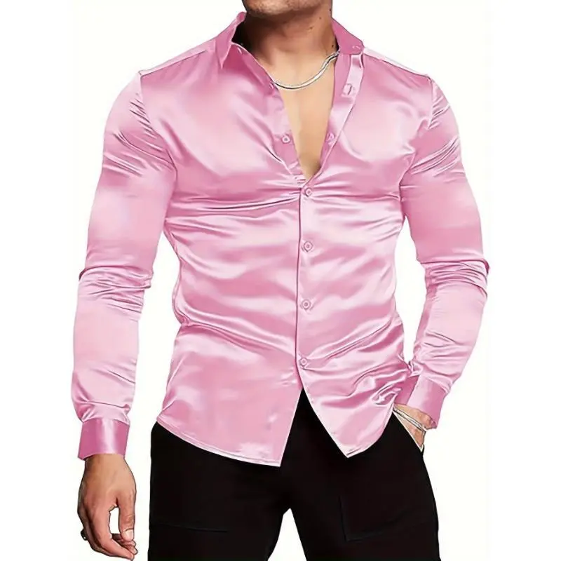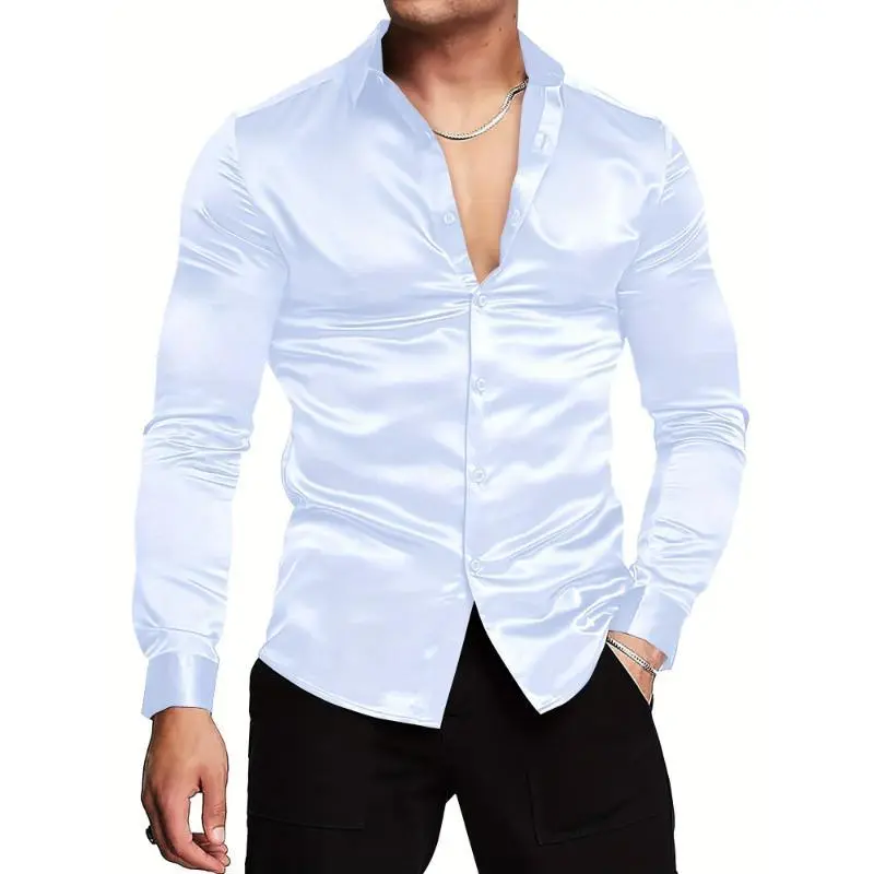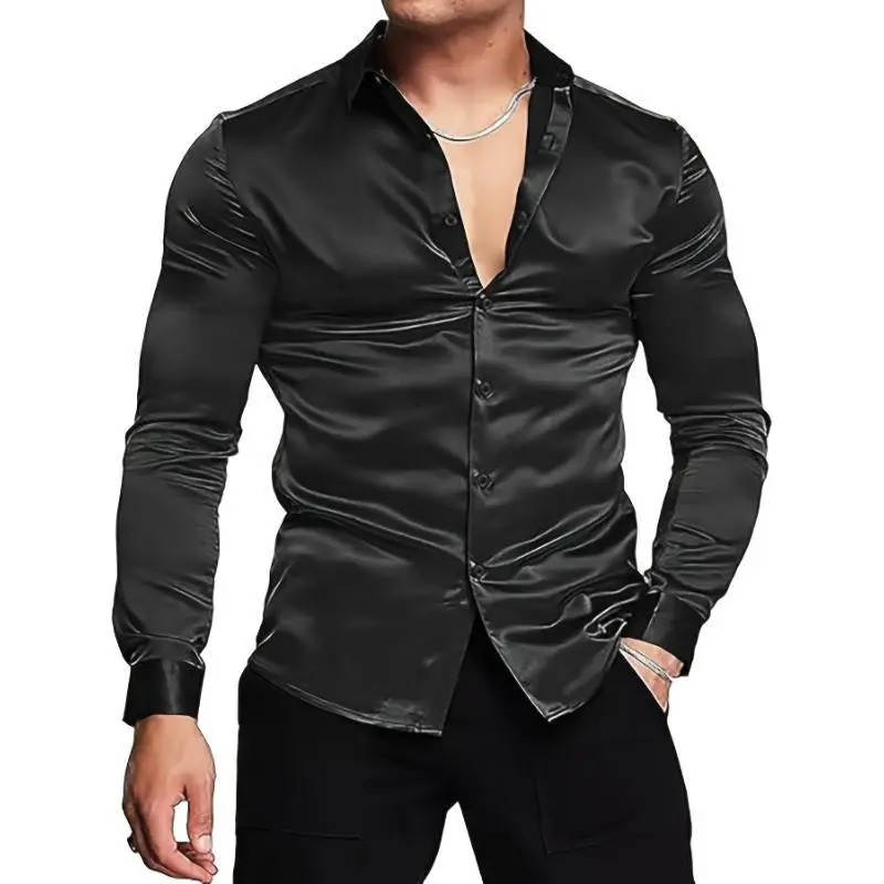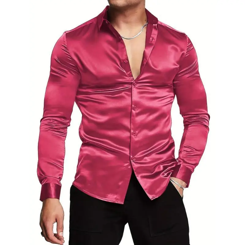 Luxury Silk-Like Satin Dress Shirt - Shiny, Long Sleeve, Casual, Slim Fit, Muscle, Button-Up, High-Quality Fabric, Stylish, Comfortable, Versatile - Perfect for Formal and Informal Occasions Menswear Spandex