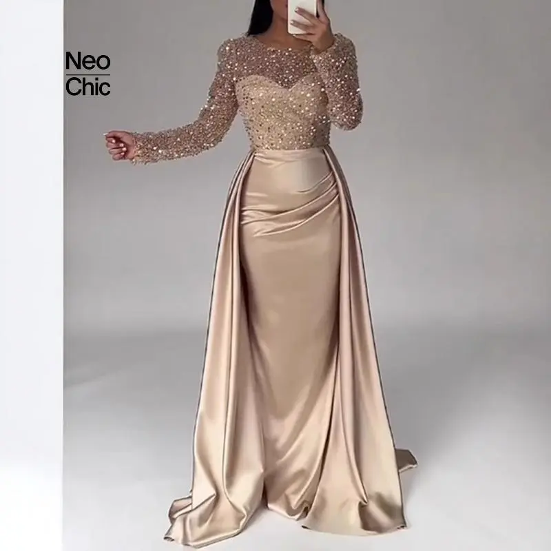 Dramatic2025Women'sBanquetLongSleeveElegantSocialiteAnnualMeetingHostQueenSequinEveningDresswithCrewneckandBasicCrewworkDesignFormal
