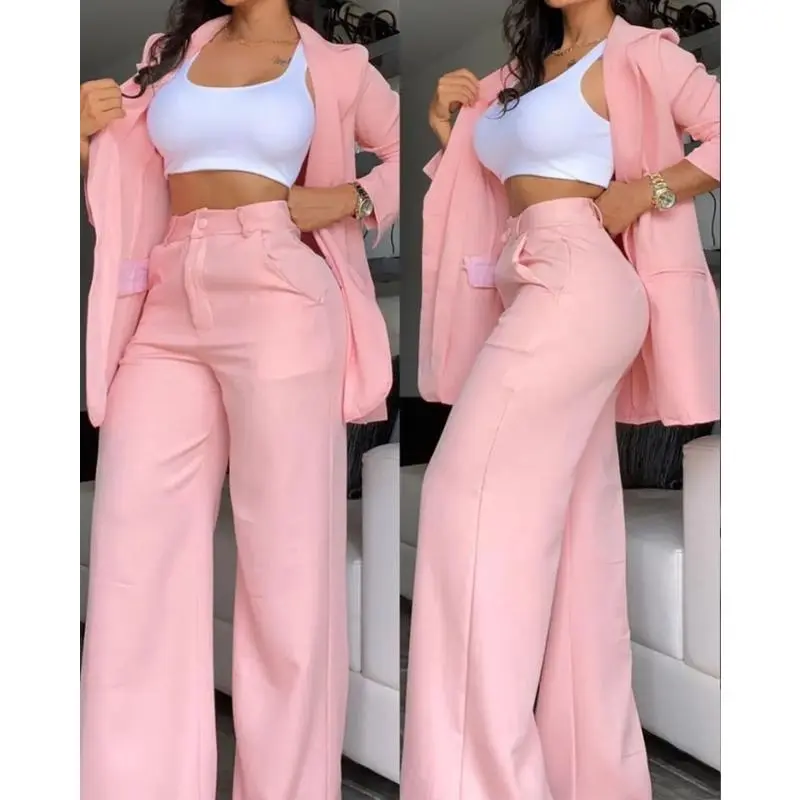 Women's Pink Plus Size Coat and Trousers Two-Piece Elegant Comfortable Basic Suit Blazer Jackets Long Sleeve Minimalist