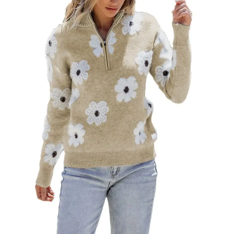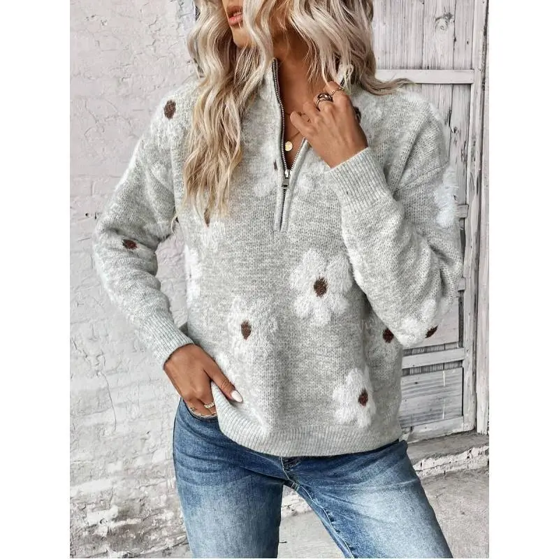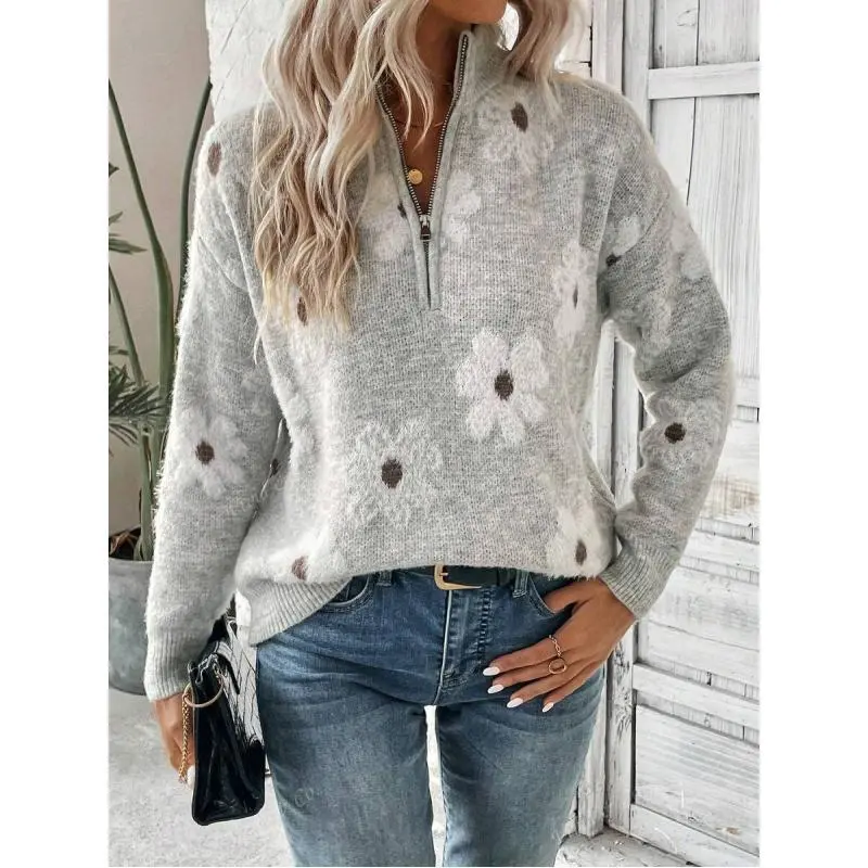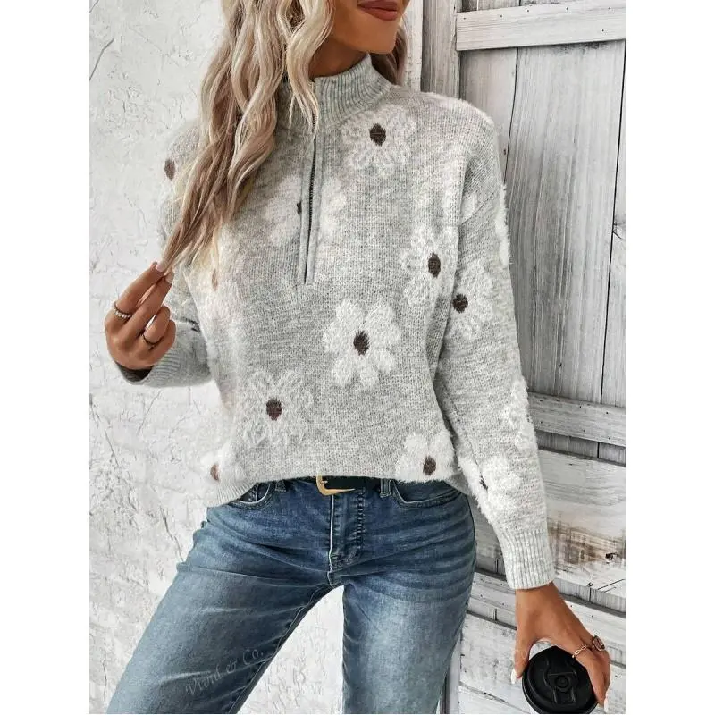 Half Zip Floral Print Drop Shoulder Pullover Sweater v neck outfit sweater outerwear coat pullover jumper casual knit pullover sweater Long Sleeve Fabric Womenswear Knitwear