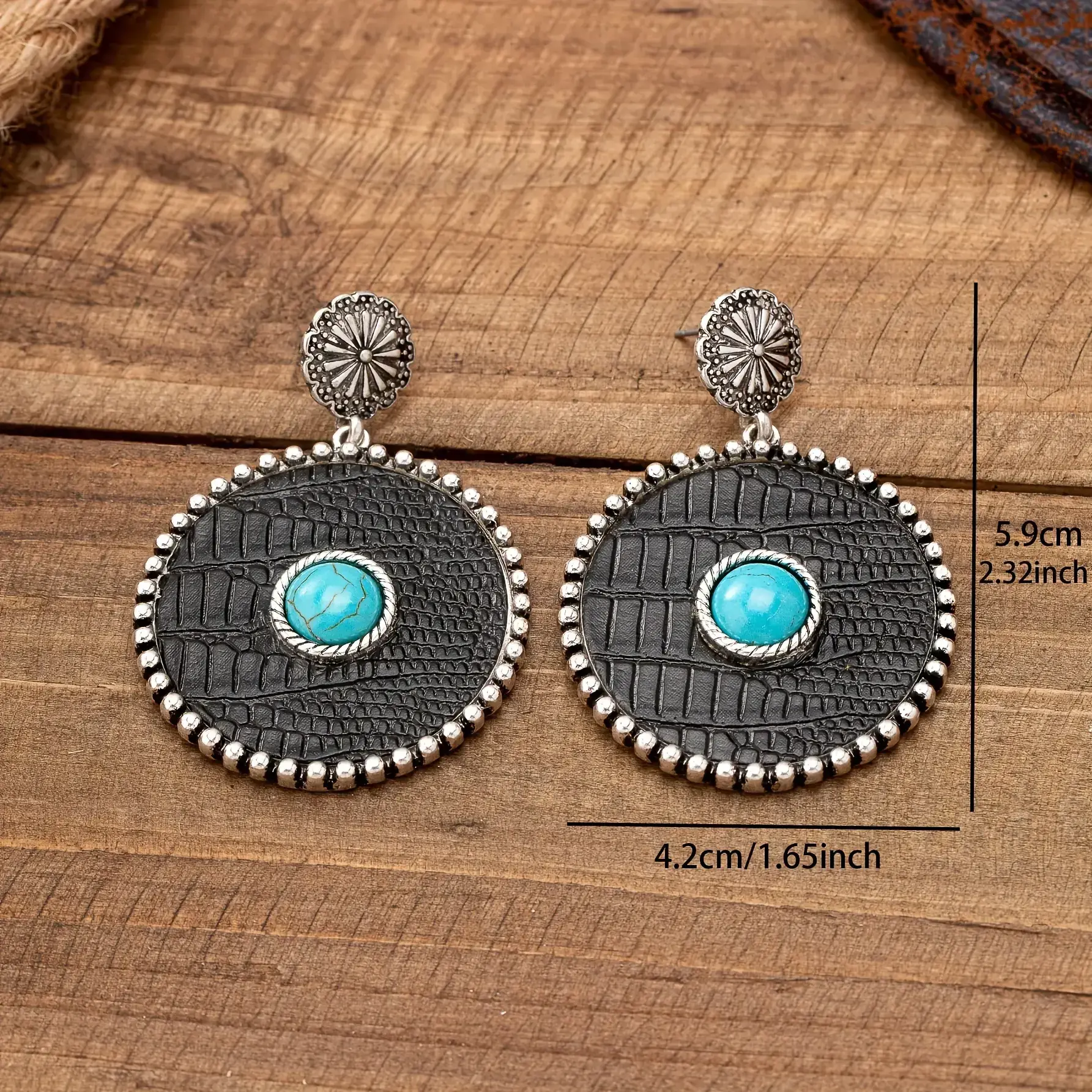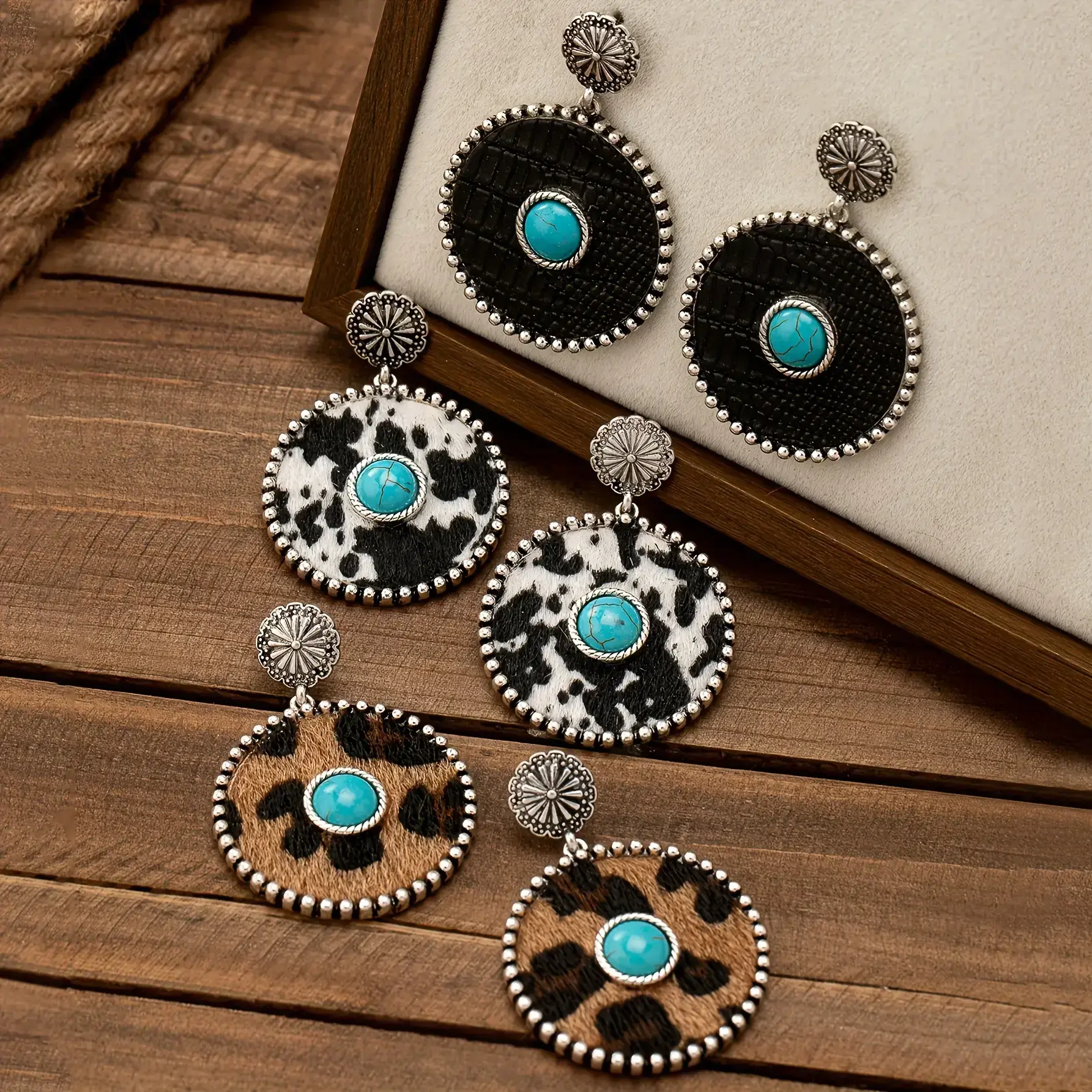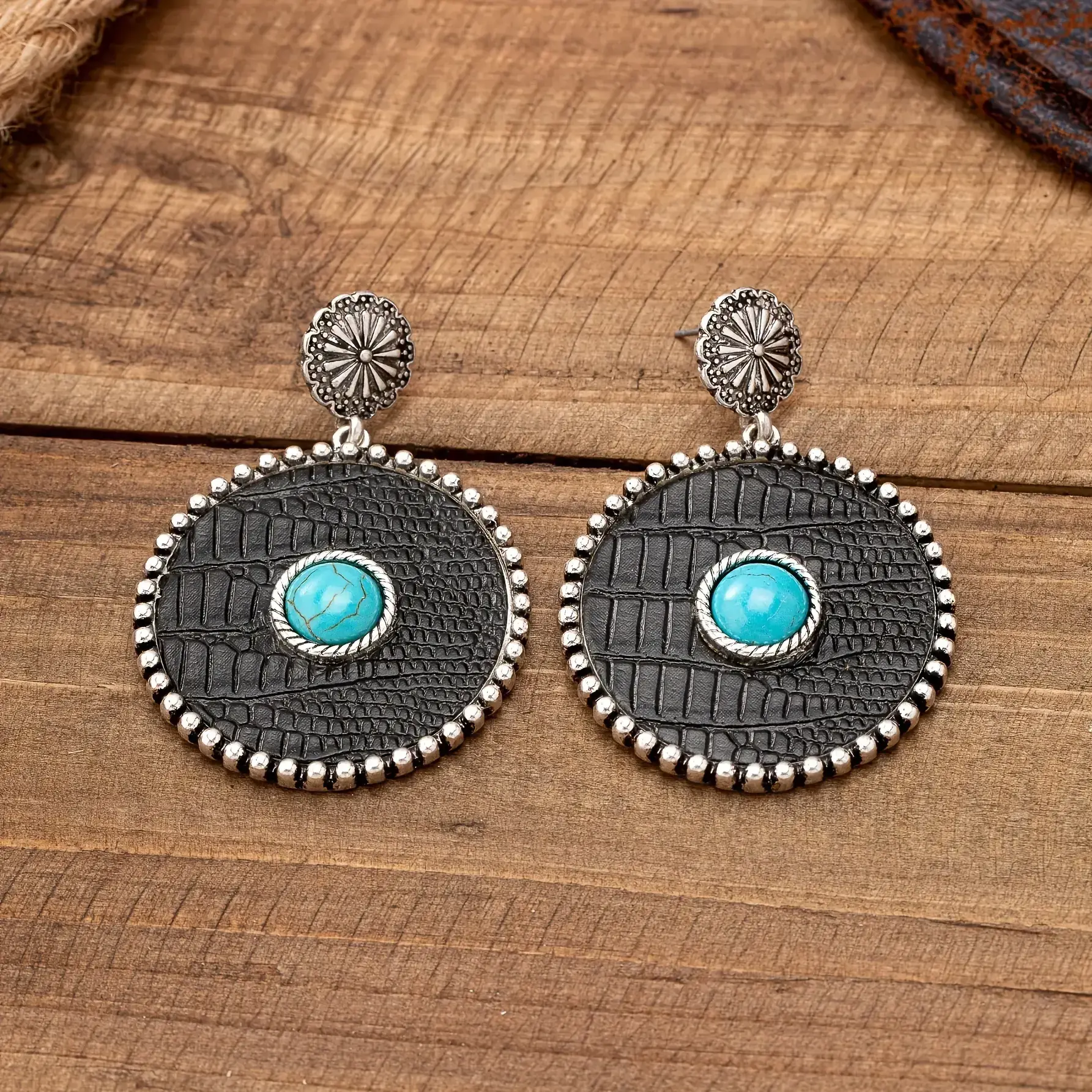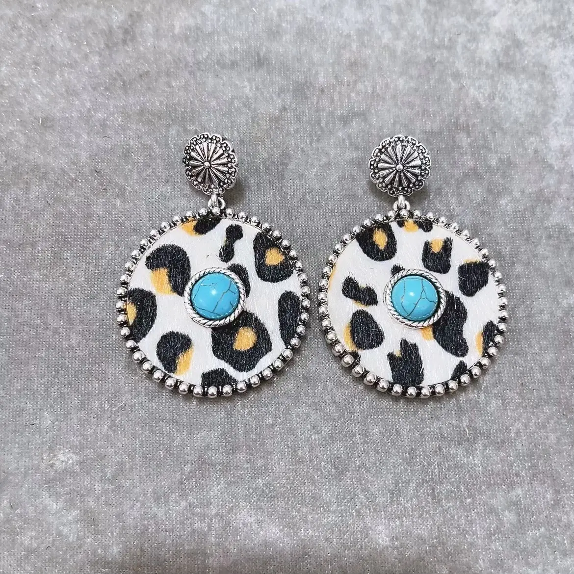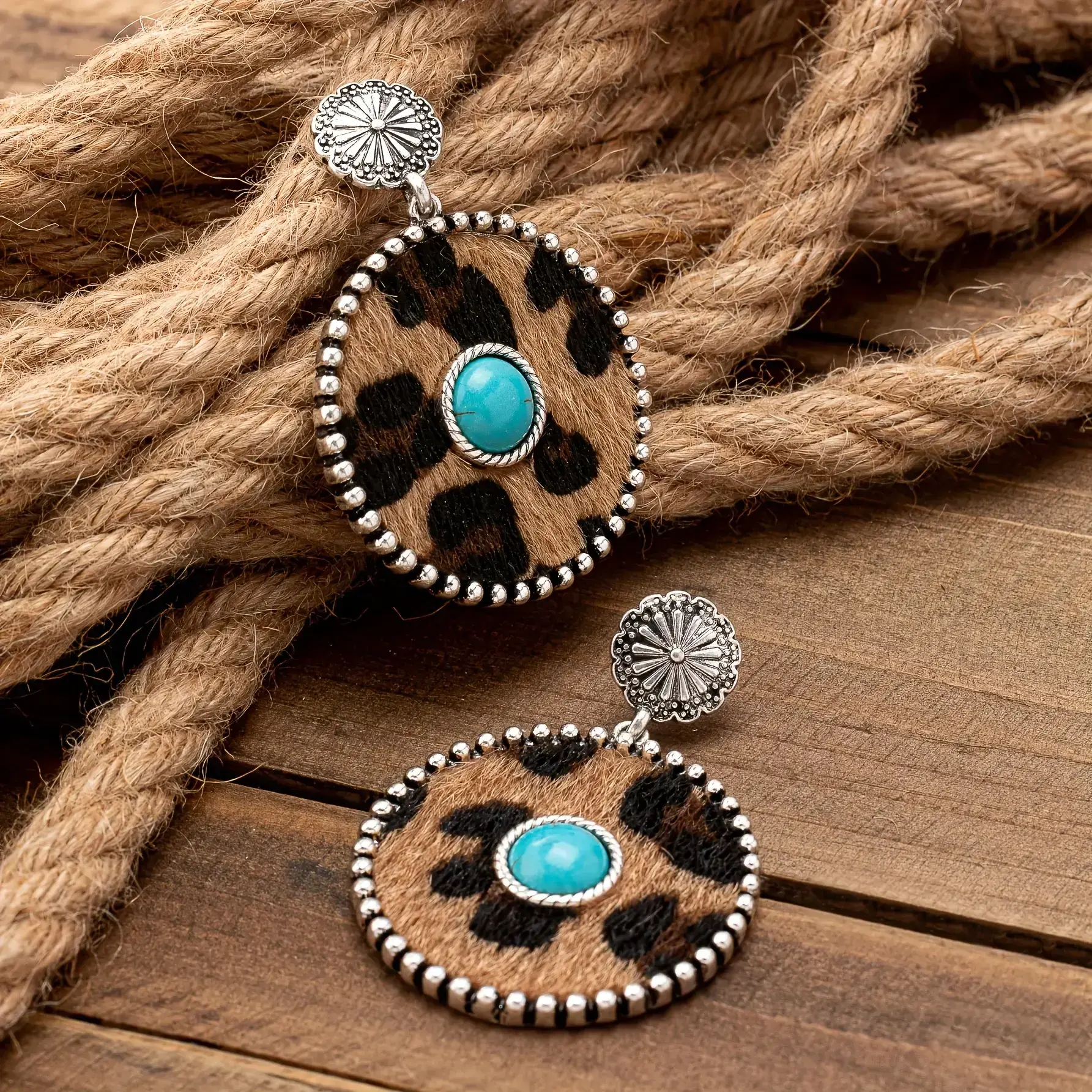 Pair of Bold Vintage-Inspired Western Cowboy Turquoise & Leopard Print Dangle Earrings - Zinc Alloy with Stainless Steel Posts, Ideal for Daily Wear or Gifting, Boho-Chic Style, Western Earrings