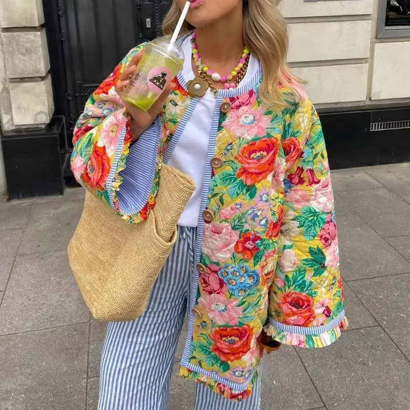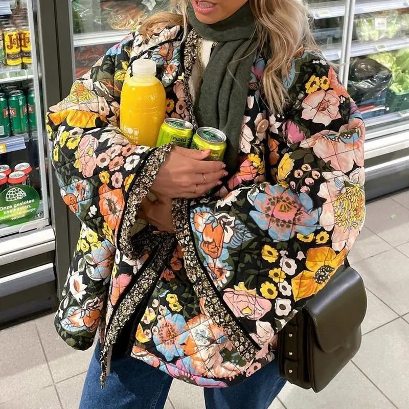 Women Winter Loose Quilted Jacket Floral Print Button Down Long Sleeve Padded Coat Warm Outwear