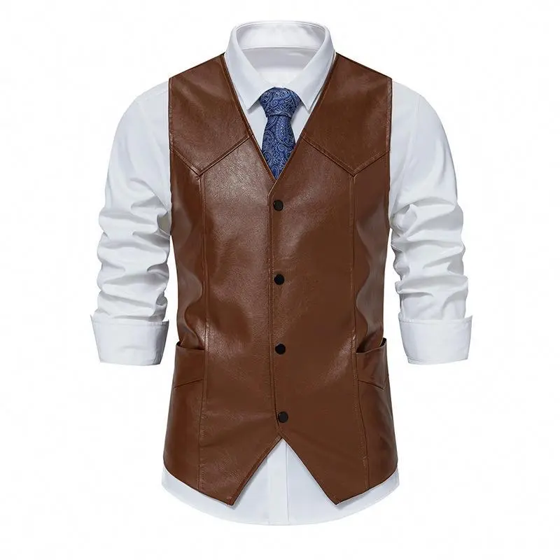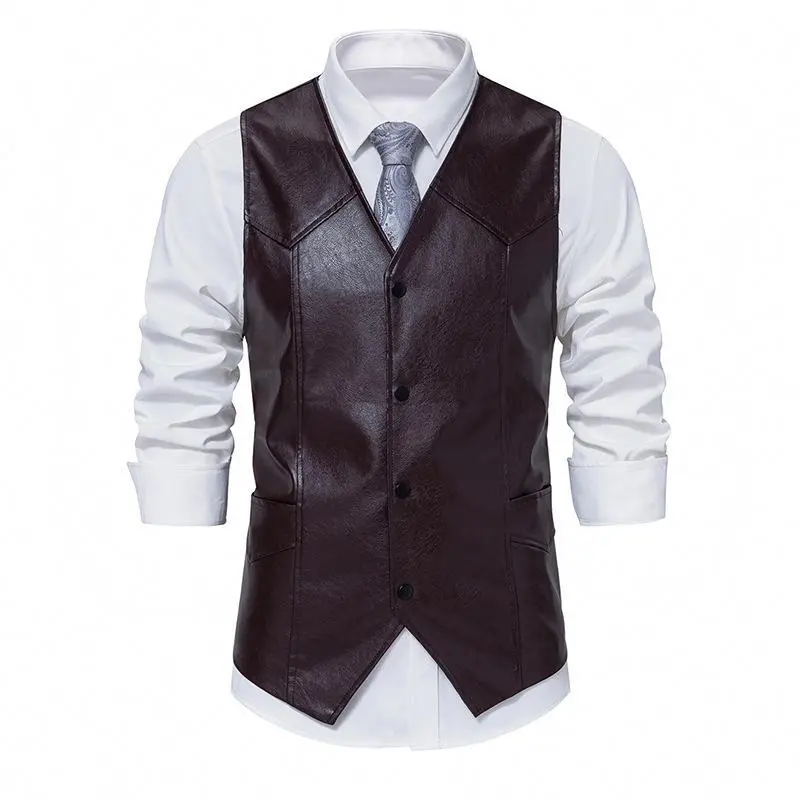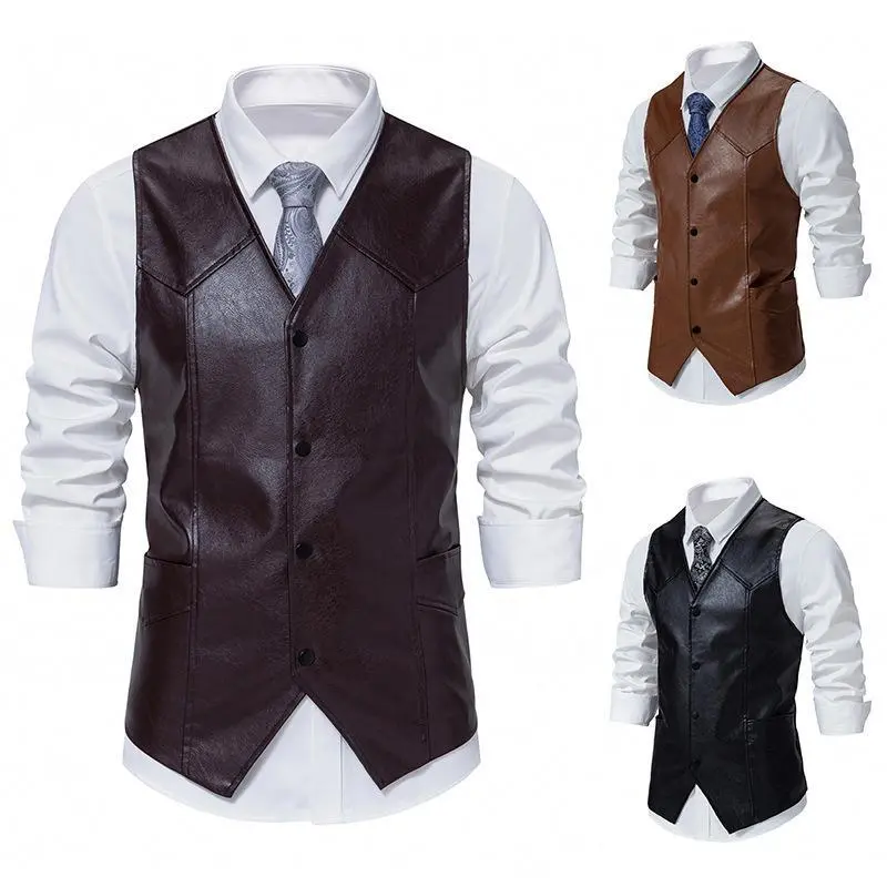 New Men's Retro V-neck Single-breasted Motorcycle Vest Fashionable European Size Slim PU Leather Vest Men