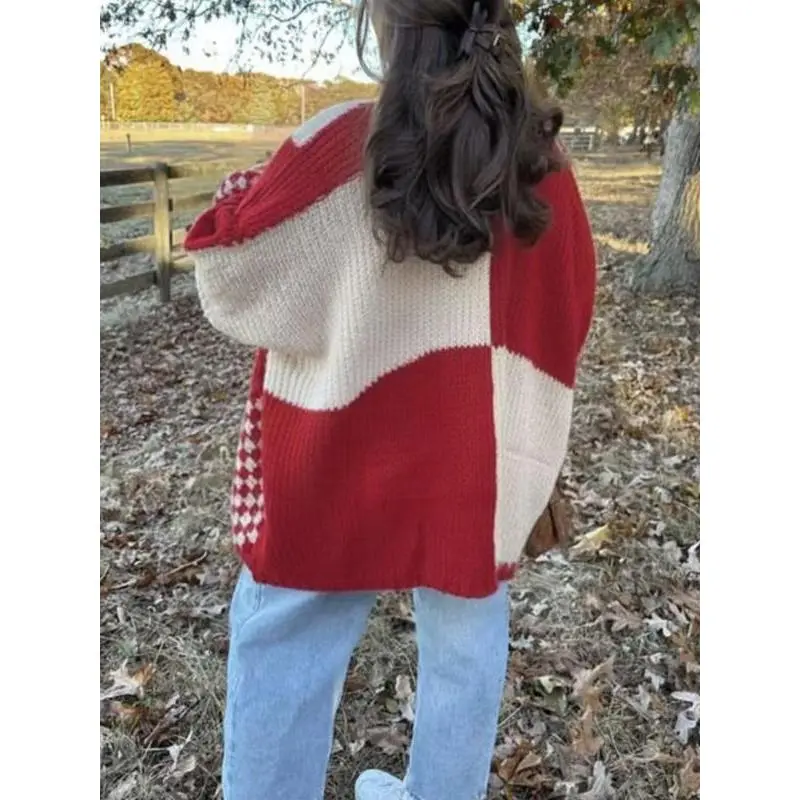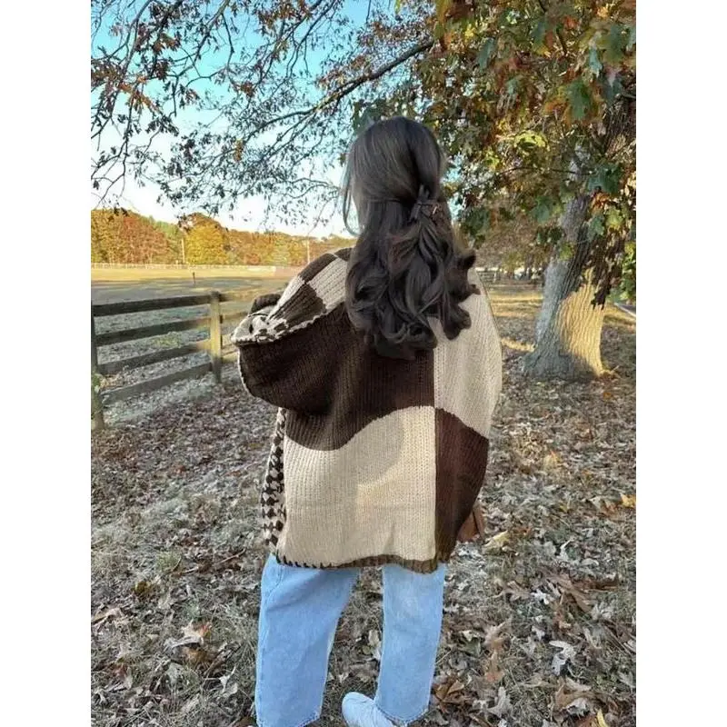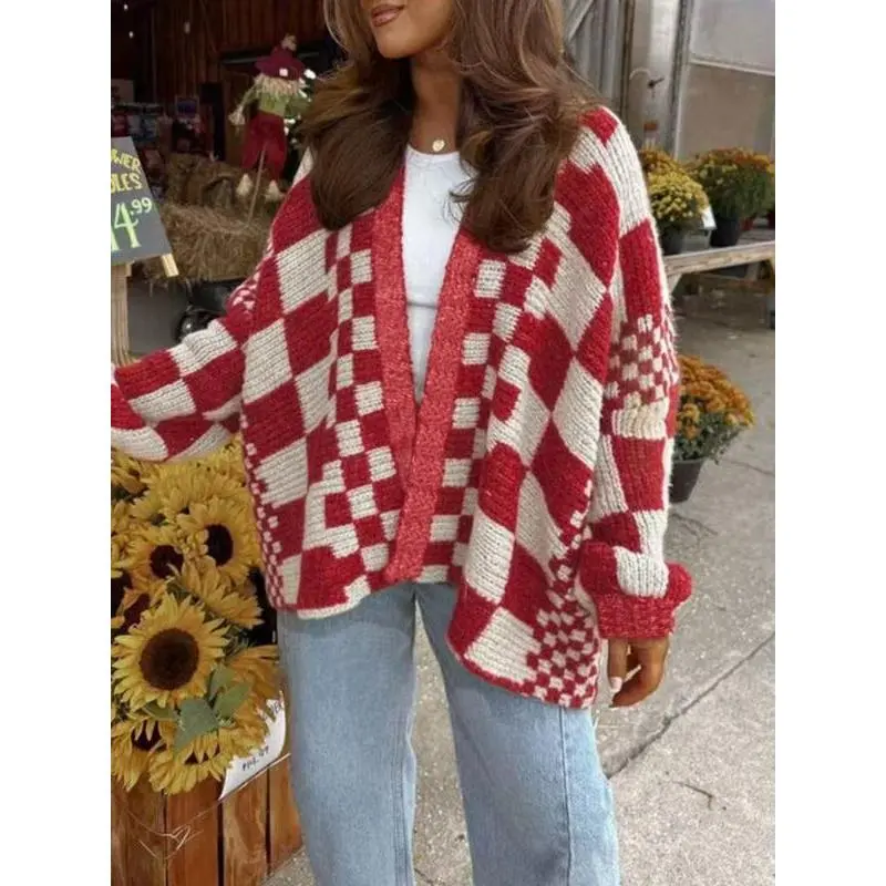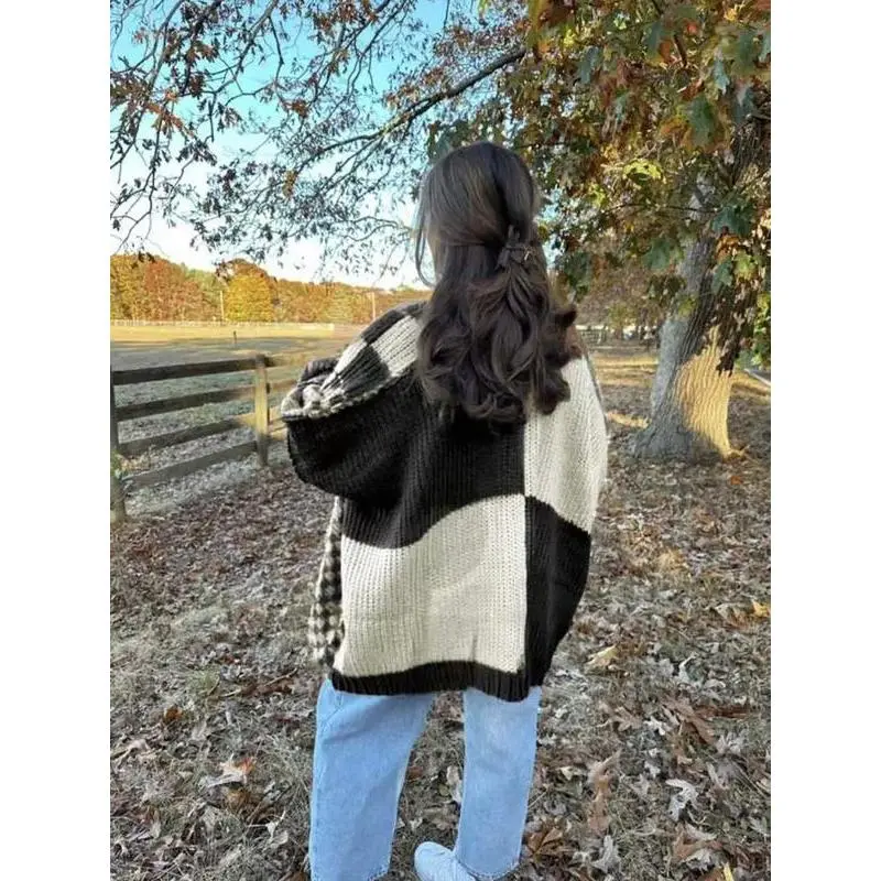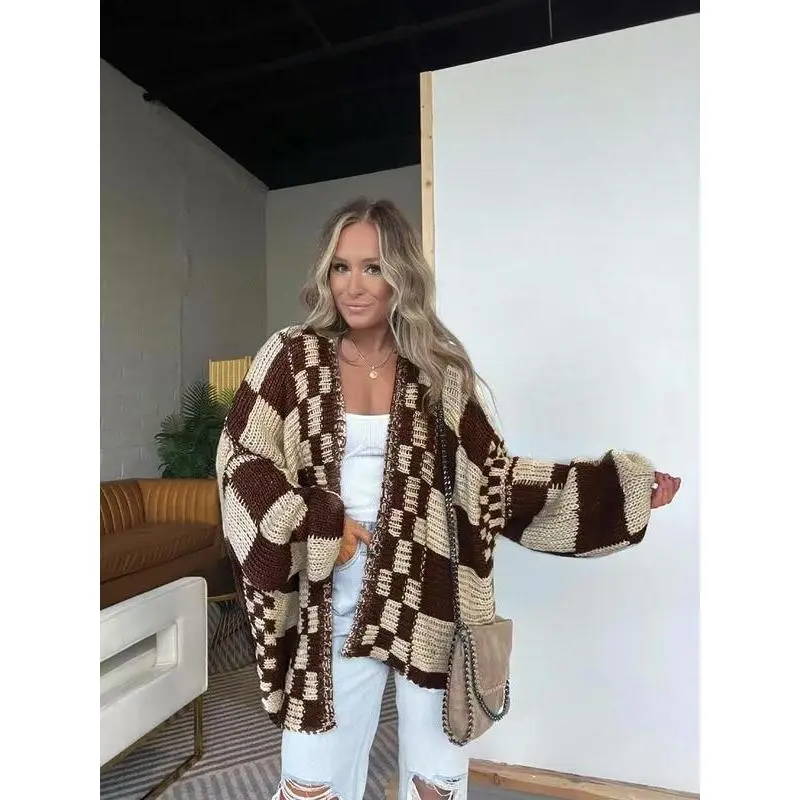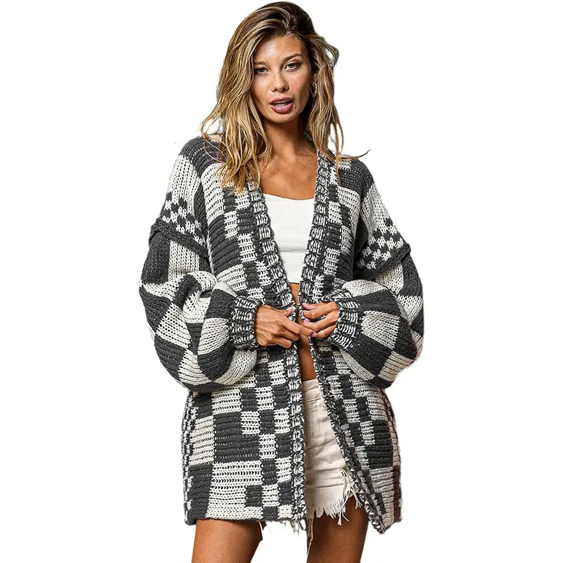 Women's Plaid Knit Cardigan, Lantern Sleeve Loose-Fitting Sweater, Casual Fall & Winter Fashion, Unique Design, New Arrival
