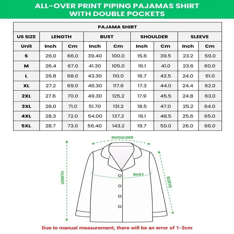 ? Thank you for placing an order with us! To ensure we process your order quickly and accurately, if you choose a custom Pajamas, PLEASE SEND US A MESSAGE IMMEDIATELY AFTER PLACING YOUR ORDER! ? For custom names or text-only orders, you can simply write the details in the note section of your order. If you��d like to customize with an image, please send it directly to us via message. Please custom below: 1. Enter the pattern you need to customize here. For example: (Pattern 2) 2. Send the photo to us via tiktok message. If you have any questions, please contact us first, whether it is a pre-sales or after-sales issue. We appreciate your support! ?? ?? Features & Design Material: 100% Polyester Satin Long-sleeve button up shirt with chest pocket Full-length pants with elastic waistband, drawstring, and two side pockets Piping around the collar, chest pocket, sleeve cuffs, and pants hem Black or white drawstring depending on the design ?? Shipping Details Processing time is 1-2 business days plus transit/shipping. Receive your order within the "Estimated arrival" timeframe. Order now and indulge in comfort and style! ?? With its whimsical all-over print and thoughtful design, this pajamas set is your ticket to ultimate relaxation wrapped in style. Perfect for gifting or treating yourself to a little luxury!
