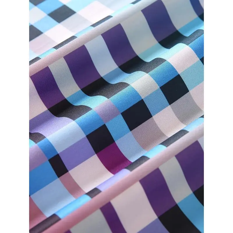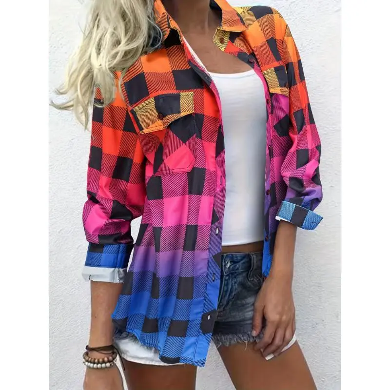 Plaid Print Button Up Shirt, Casual Gradient Color Long Sleeve Breast Pockets Shirt For Spring & Fall, Women's Clothing Top Womenswear Blouse Fitted