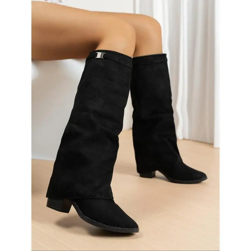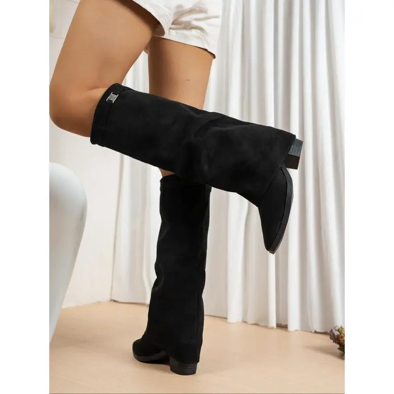 Faux Suede Shark Classic Buckle Knee High Boots, Stylish Comfortable Women's Fashion Shoes for Any Occasion, Footwear