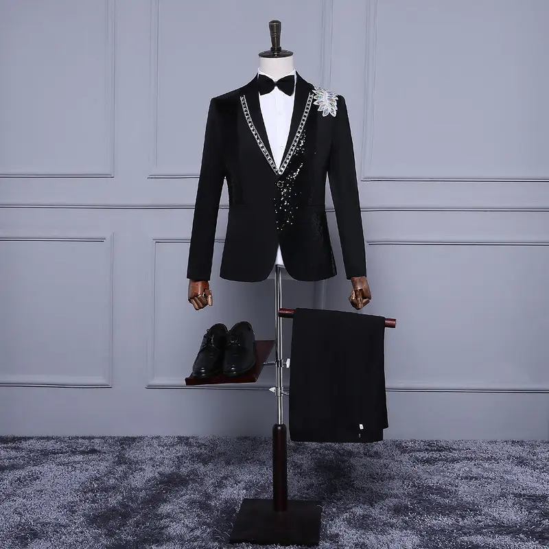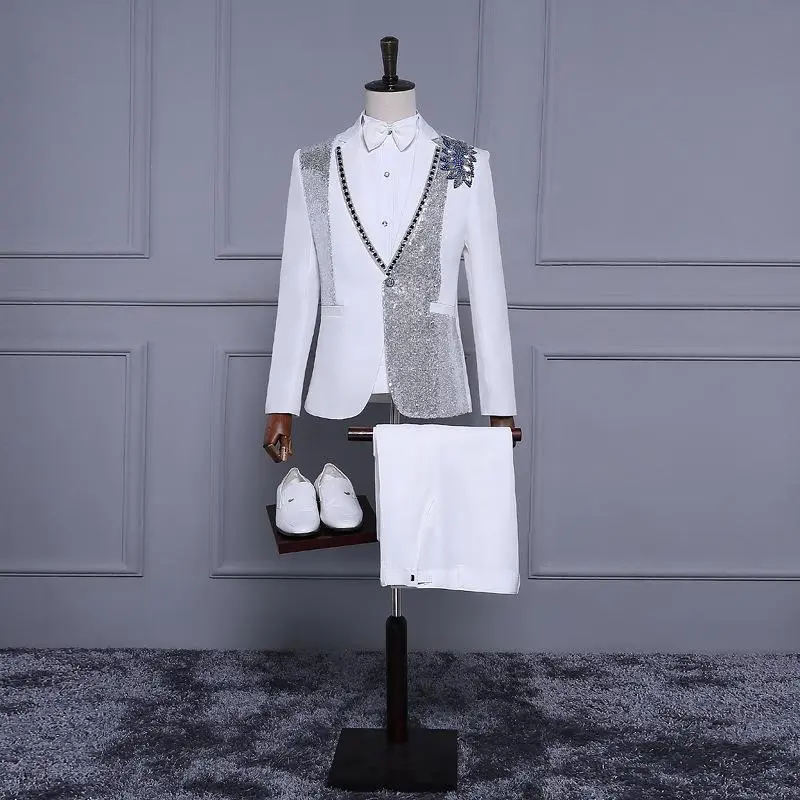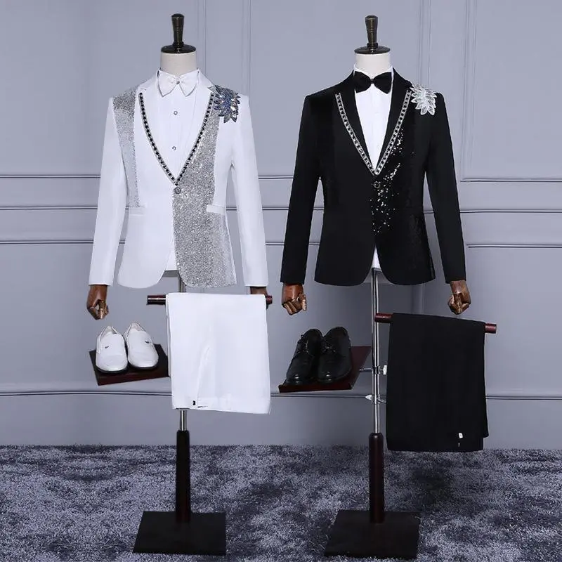 MengDDshopStagePerformanceClothingMaleSlim-fitSequinSingerHostMCDressSuitJacketPhotoStudiosuitClothesBlackandWhiteJacketFabricMenswearFashionTop