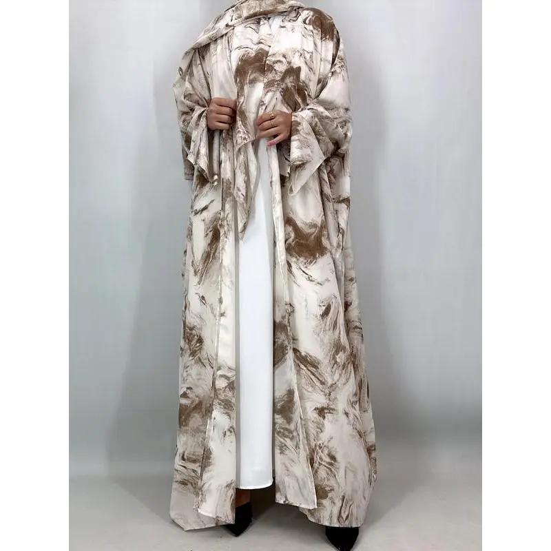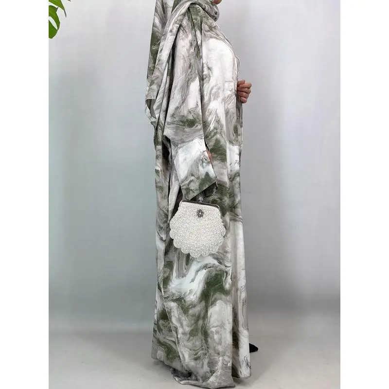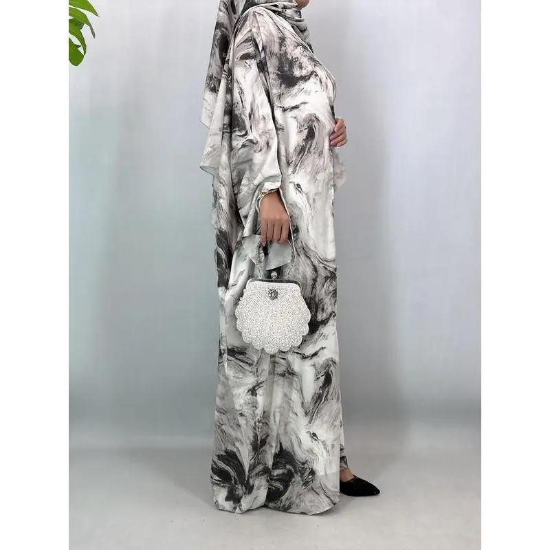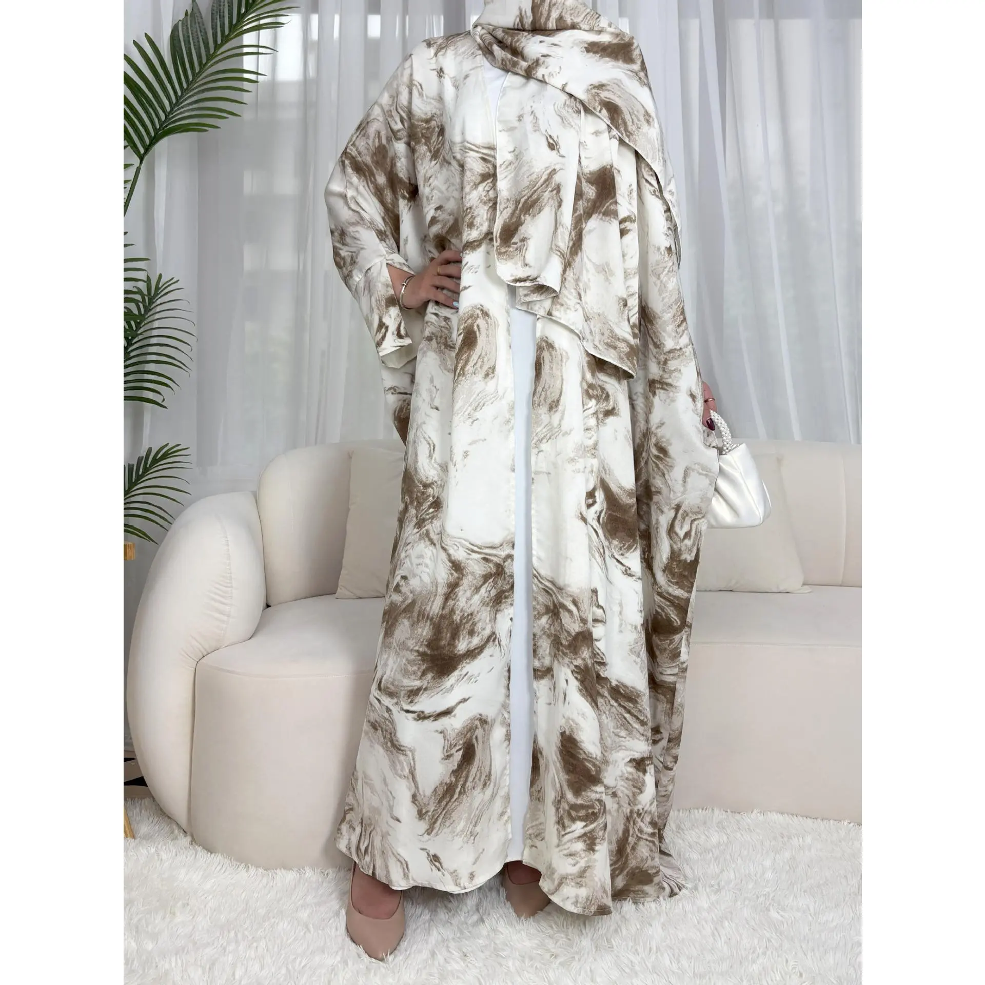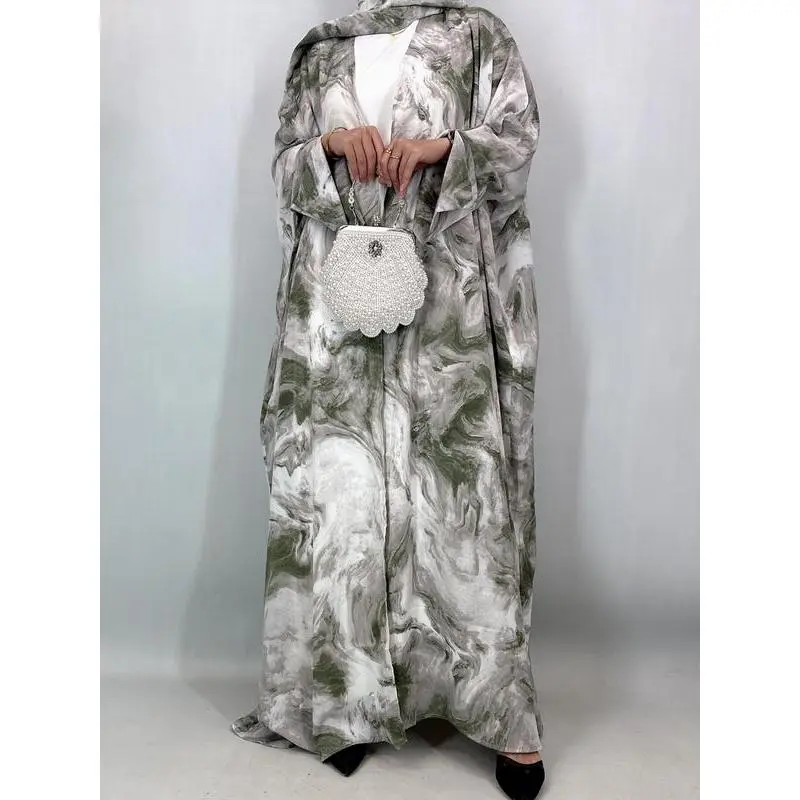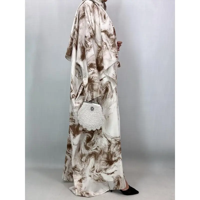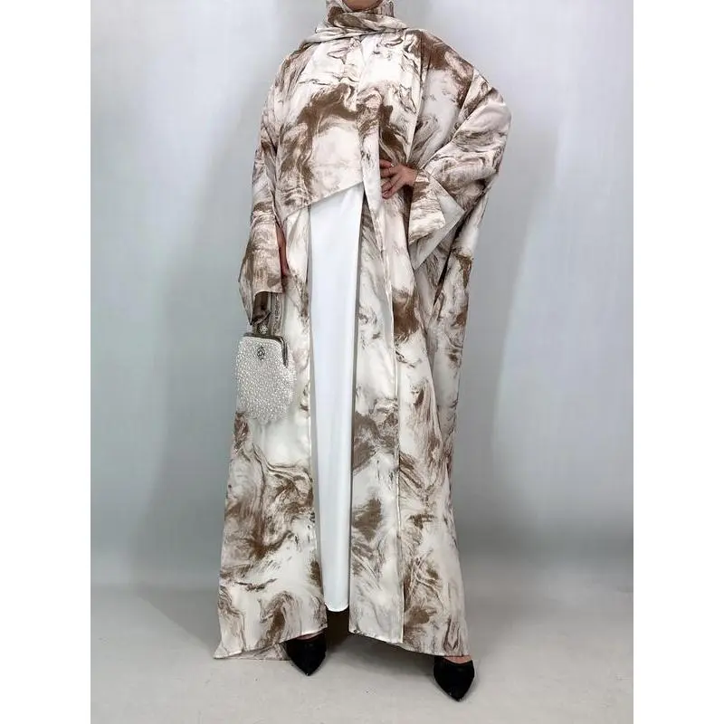 [Includes Hijab] Women's Artistic Ink Print Batwing Sleeve Long Robe Coat Set, Loose-Fitting Vacation Style Outerwear with Pockets, All Season Wear
