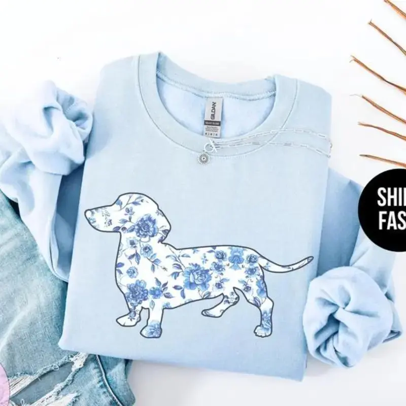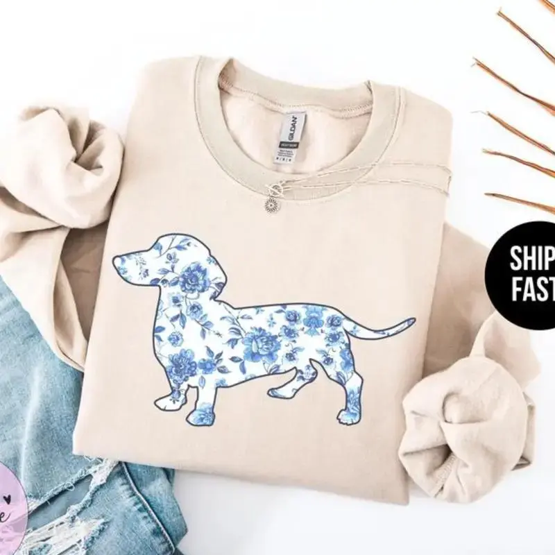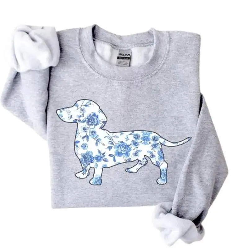(Sale Off Up To 50%) French Blue Toile Dachshund Sweatshirt, Dog Lover Sweatshirt, Cute Doxie Pullover, Pet Parent Shirt, Dog Mom Sweatshirt, Doxie Tee Crewneck Unisex, Full Color, For Men, For Women, Casual, Classic Fashion, Tee Print