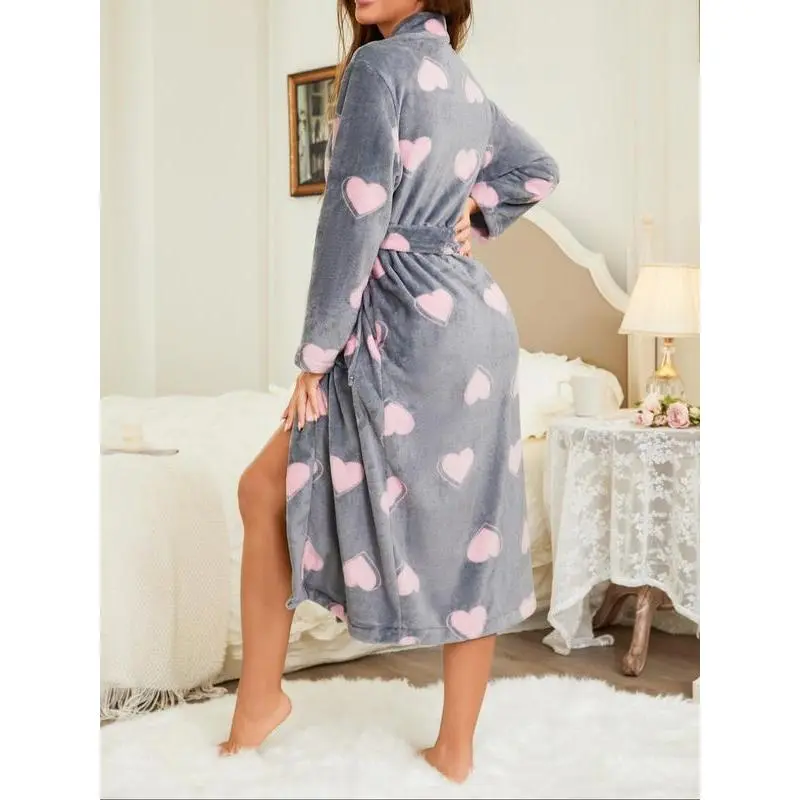Women's pink heart-shaped printed gray nightgown, thick robe, autumn and winter velvet warm home clothes, outdoor leisure vacation pajamas