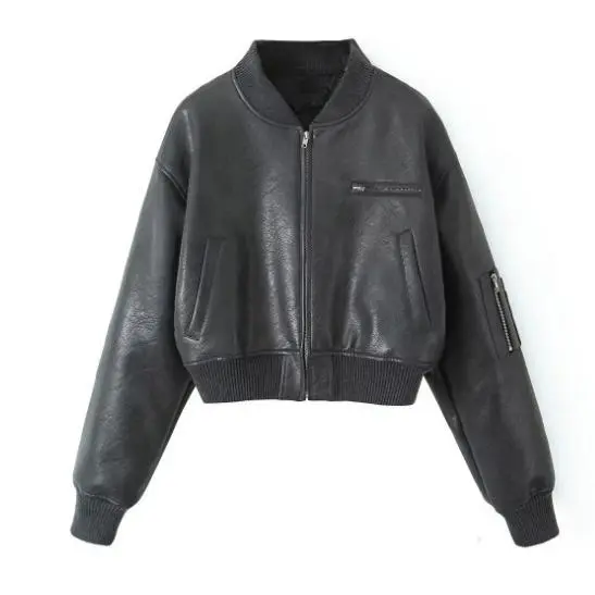 Womens Faux Leather Bomber Jackets Baseball Collar Zip Up Cropped Biker Coat with Pockets