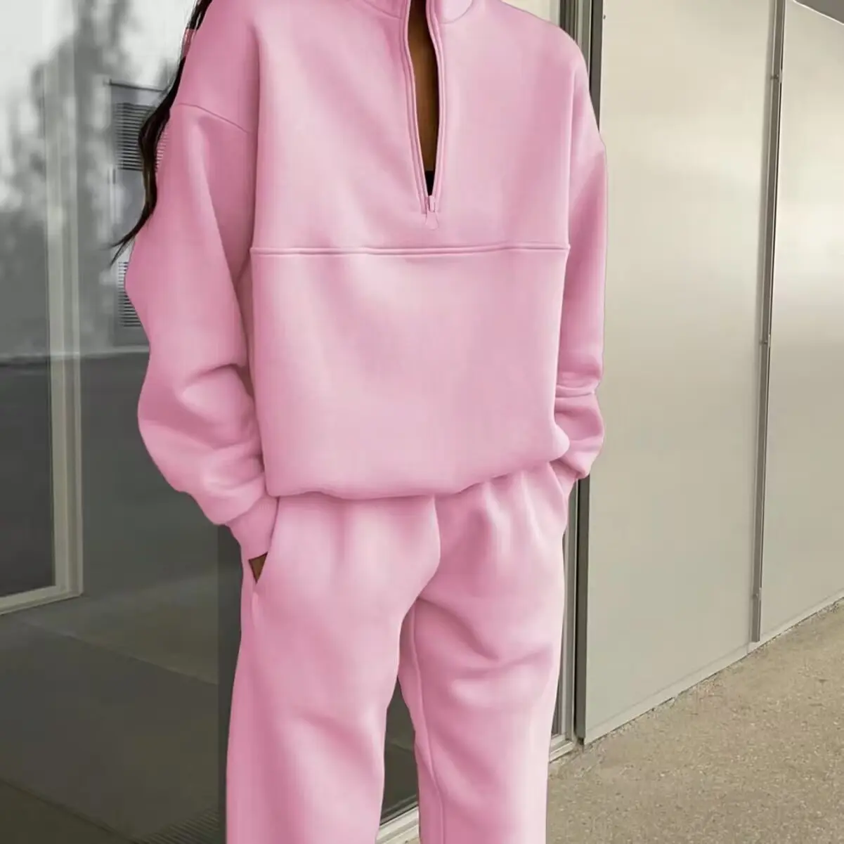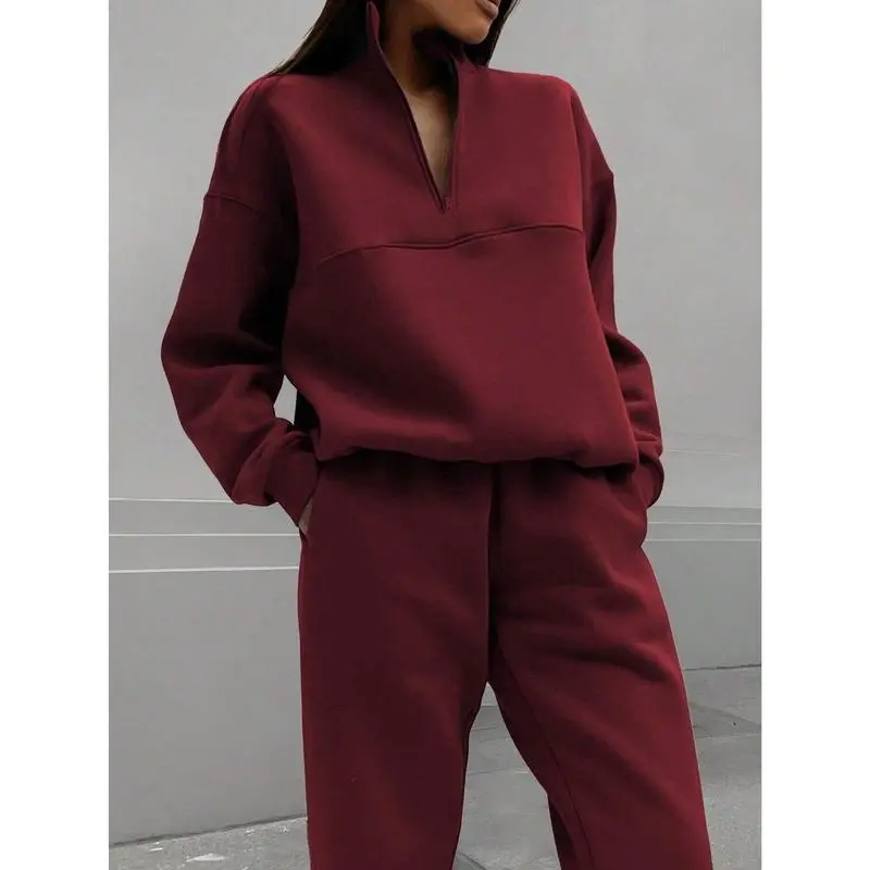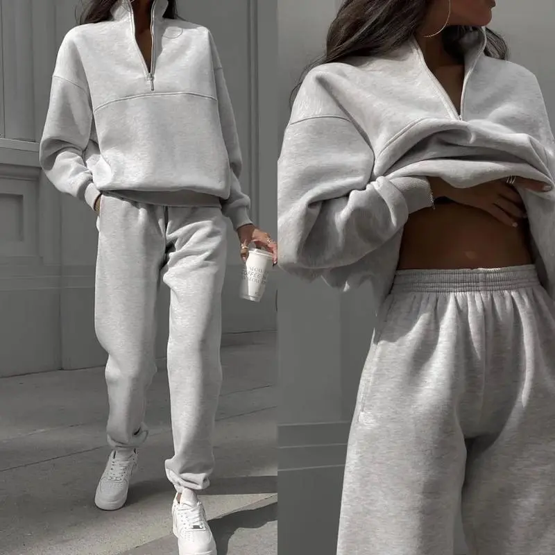 2025Women'sMinimalistChicHalf-ZipLoungewearSetHighNeckPullover&LooseJoggerPantsTwo-PieceCasualFashionClothes