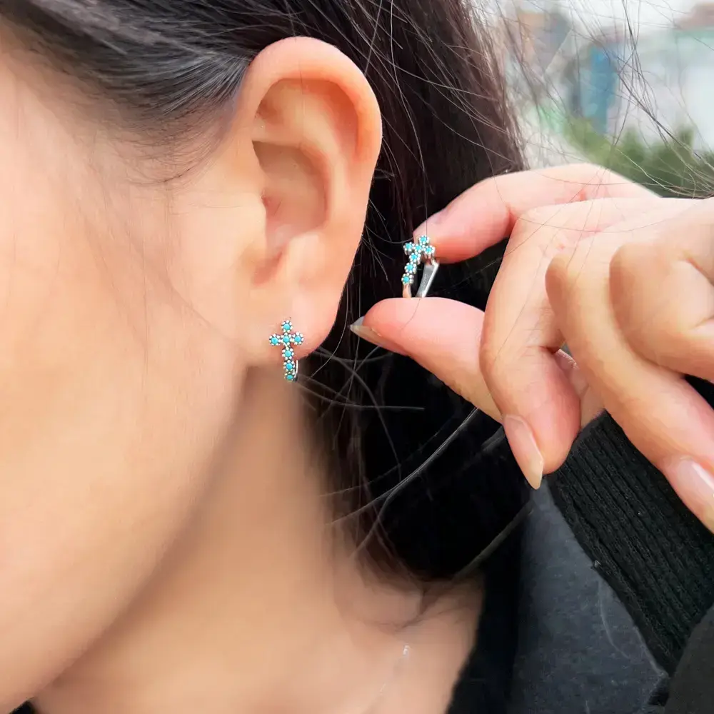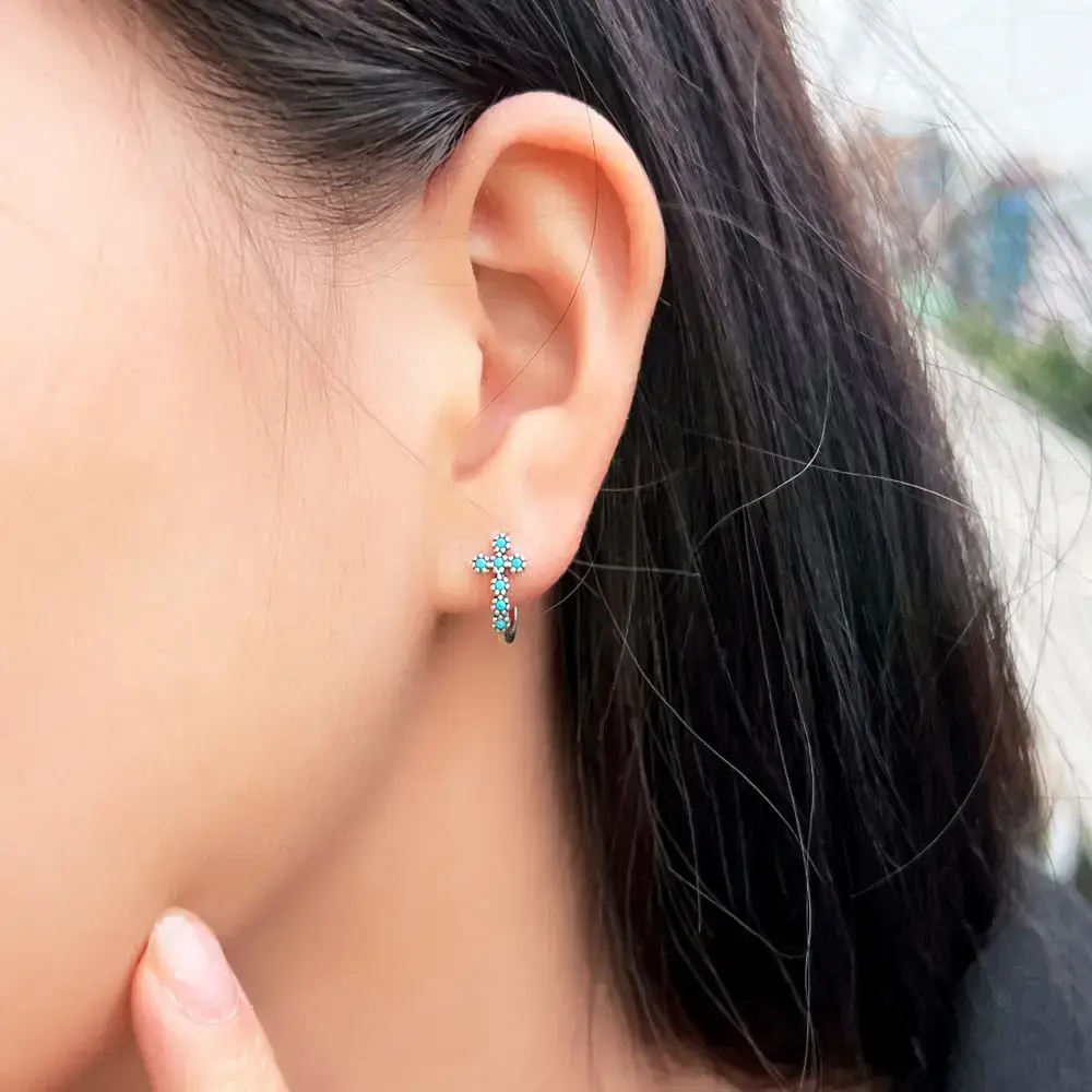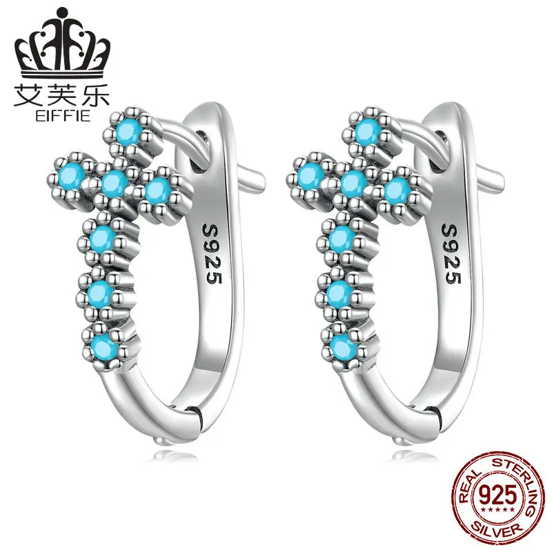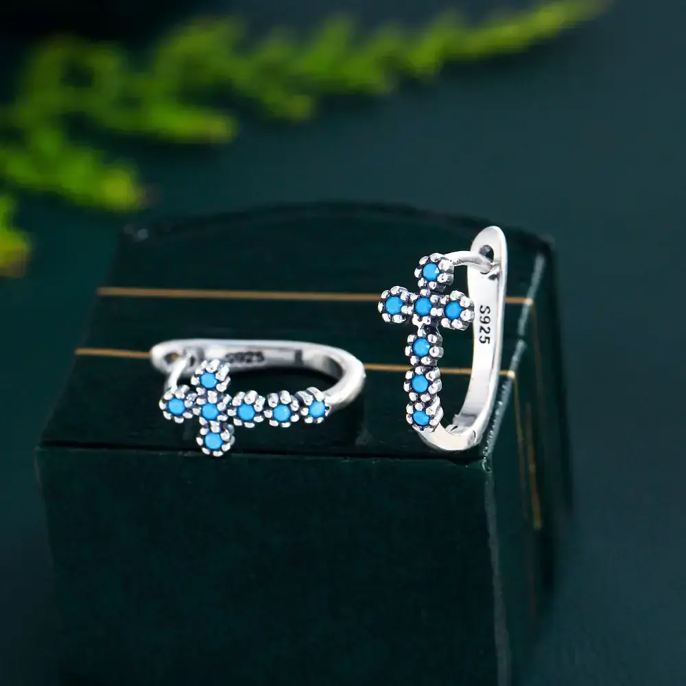 1Pair Genuine 925 Sterling Silver Blue Turquoise Cross Ear Buckles Stud Hoop Earrings For Women Party Engagement Fine Jewelry Gifts