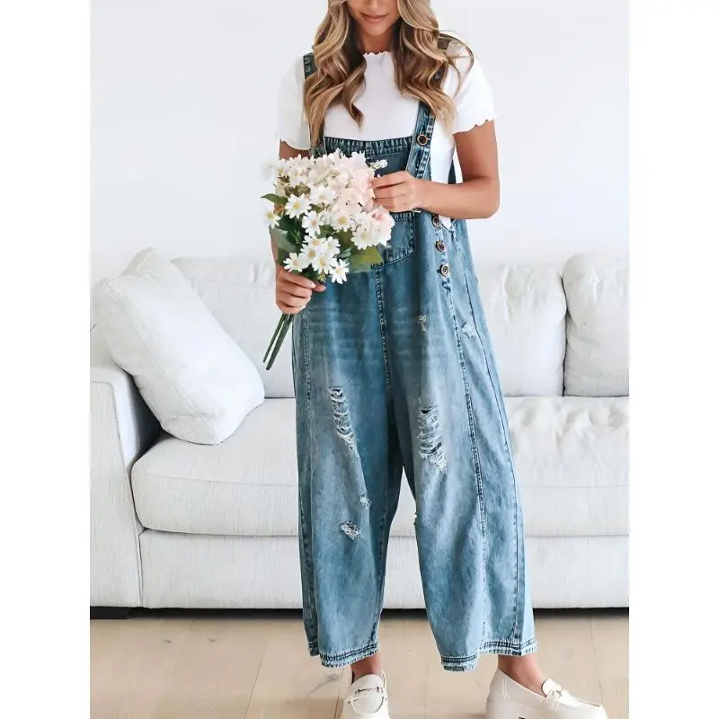 [Distressed Denim Overalls] Loose Fit Denim Overalls - Women's Casual Adjustable Strap Distressed Bib Jeans Jumpsuits With Pocket