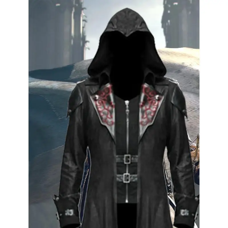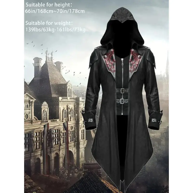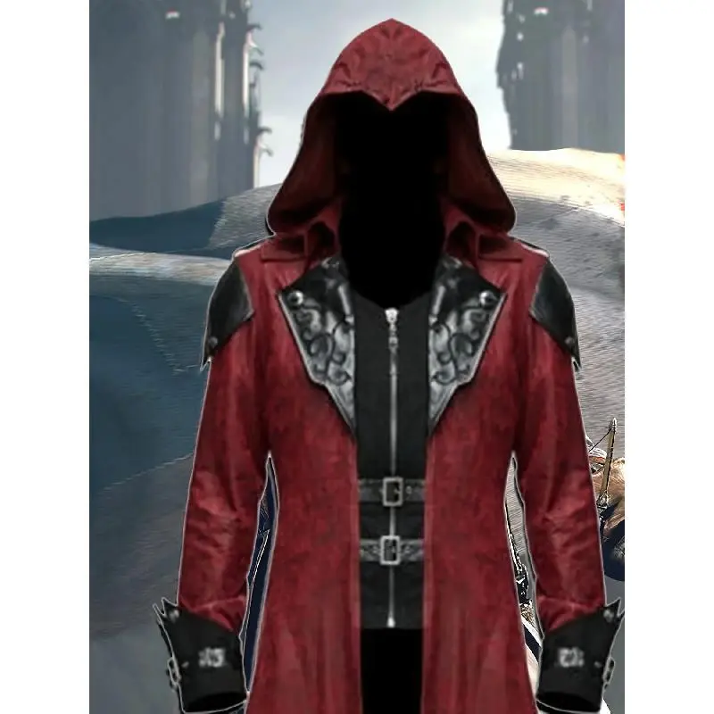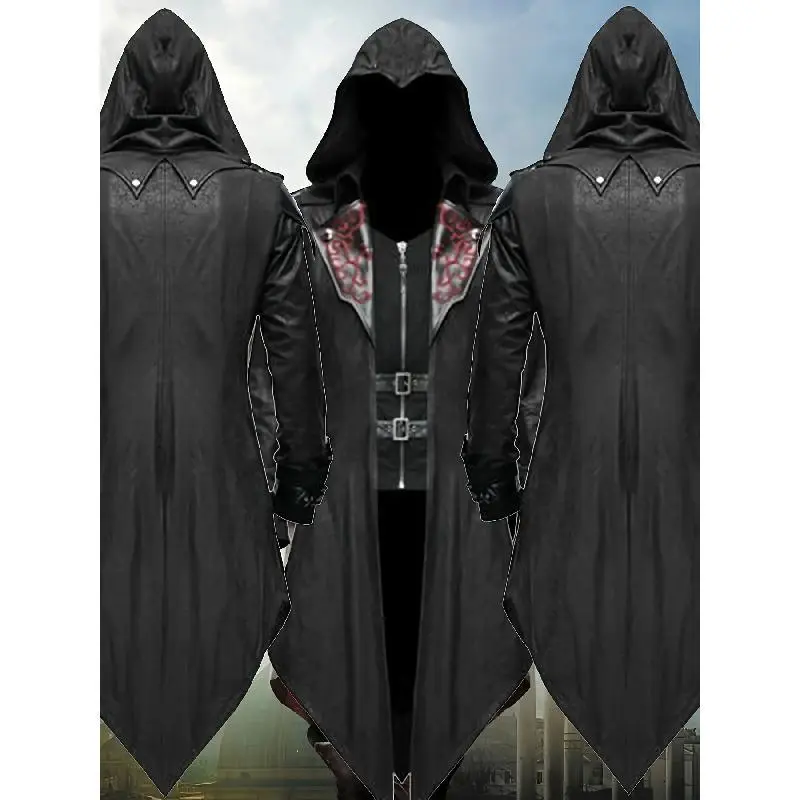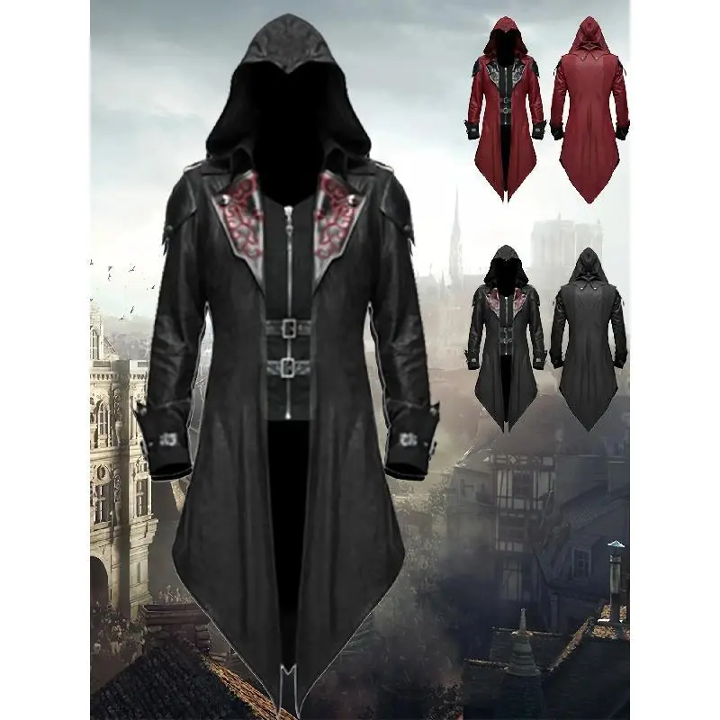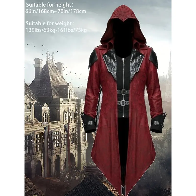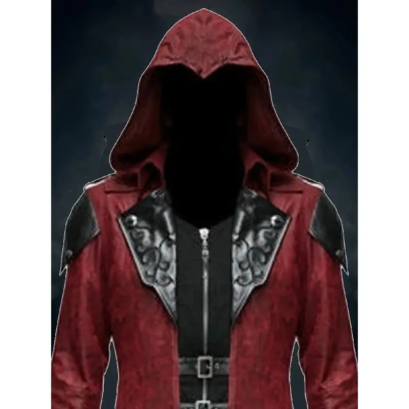 [VintageSteamPunkHoodedJacket]3pcsMen'sGothicAssassinCosplayCostumeSet-VintageRed&BlackPolyesterSteamPunkStyleHoodedJacket-EmbroideredDetails,DitsyFloralPattern,V-Collar,SlightStretch,LooseFit,2Wristbands