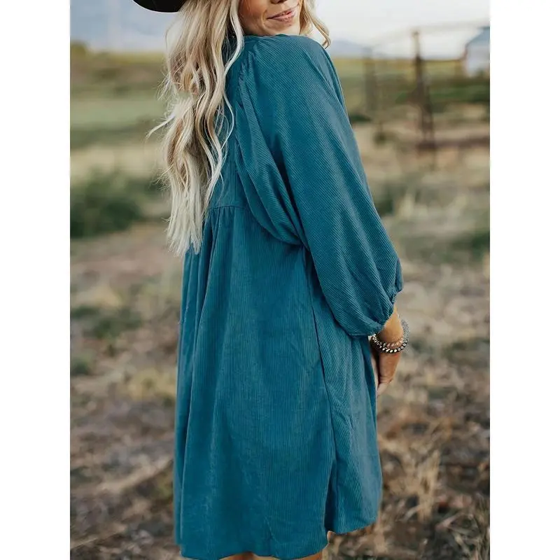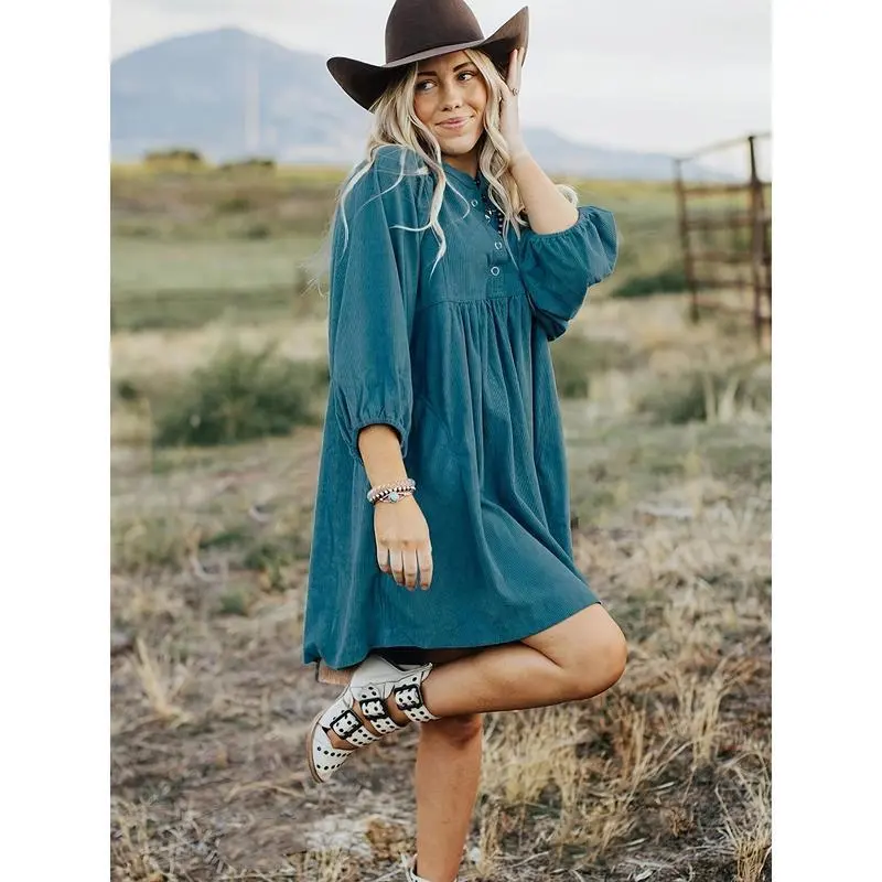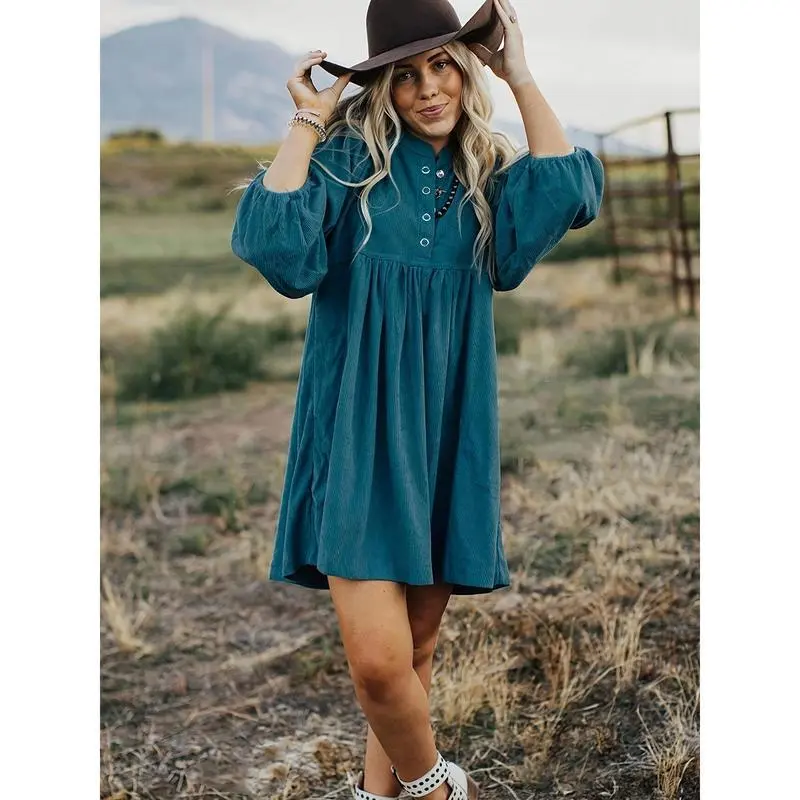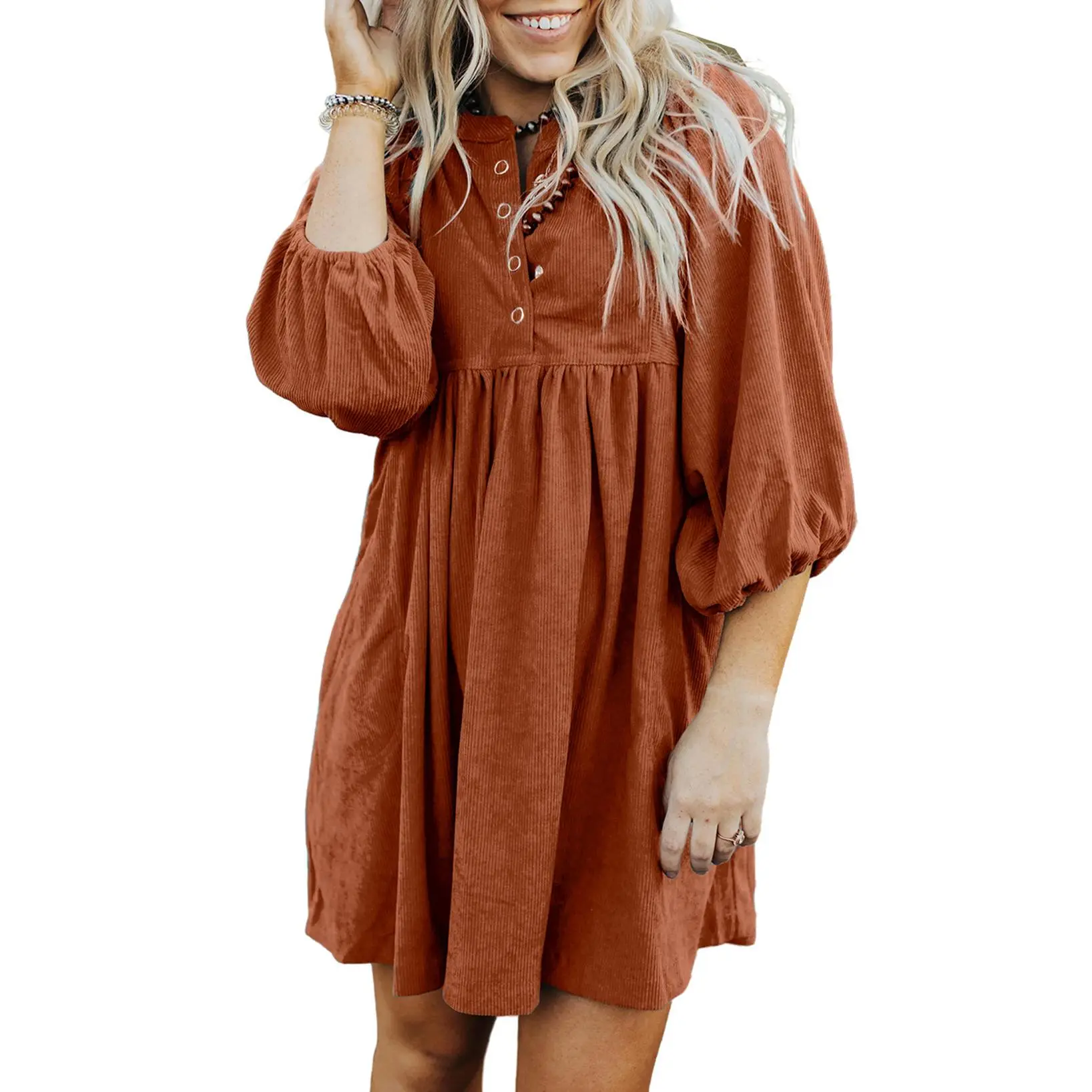 Women's A-Line Corduroy Dress with 3/4 Puff Sleeves - MachineNeck Solid Color Dress for Spring Summer Fall, Casual to Semi-Formal Wear, Smooth Texture Non-Stretch Fabric,Elegant A-Line Silhouette, Versatile Seasonal Wardrobe Essential, Cu Womenswear Basi