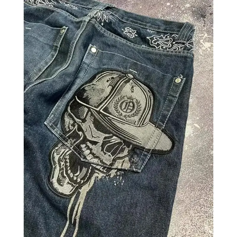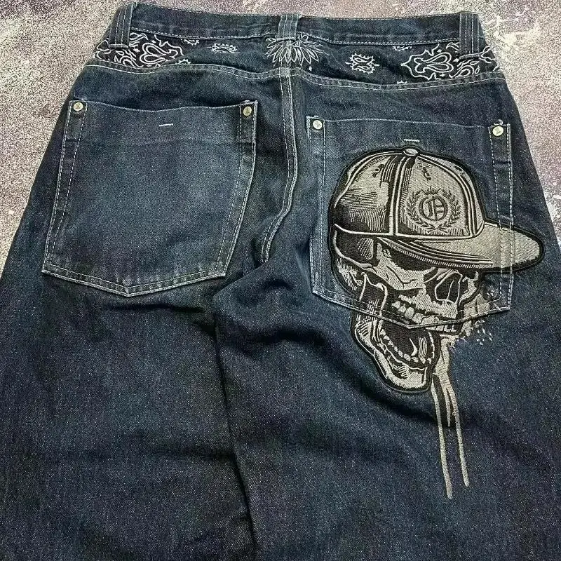 StreetFashionTrendSkullEmbroideredJeansWomenHarajukuJokerStraightWide-legPantsCoupleCasualJeansHighWaistedRippedStreetwearTrouserWomenswear