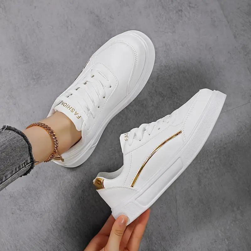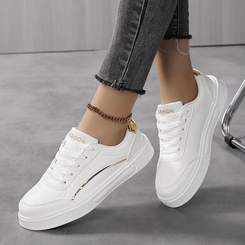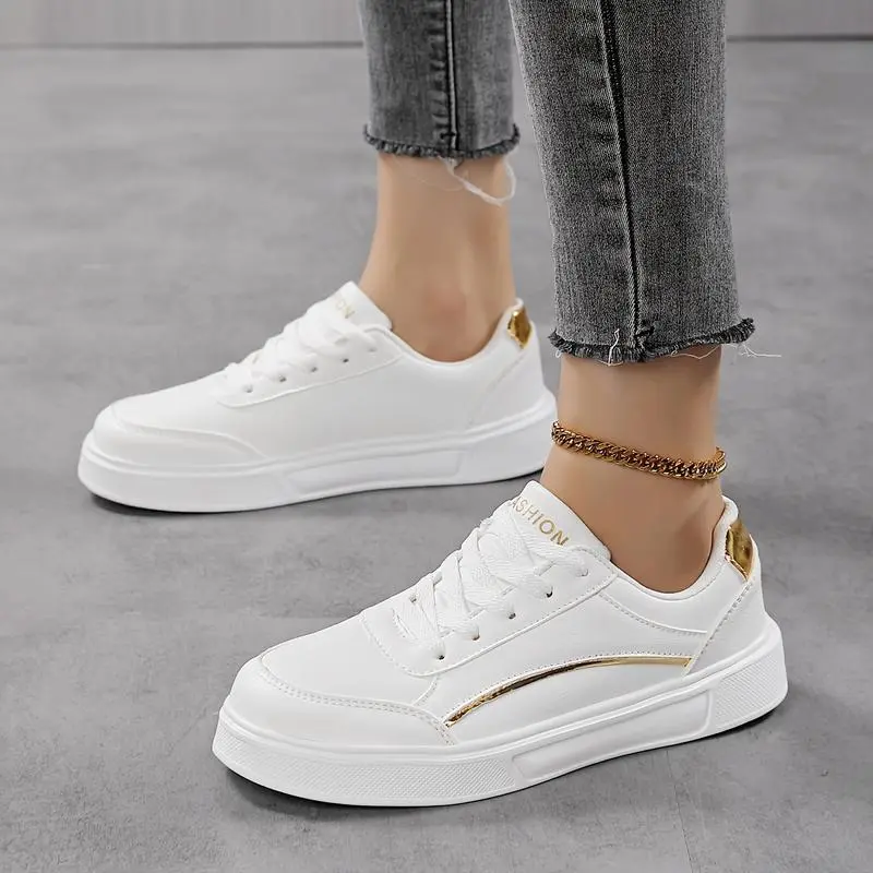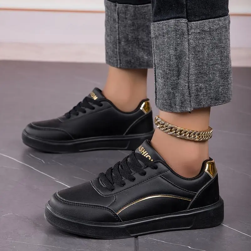 2025Women'sBlackSkateboardShoeswithGoldEmbellishments-LightweightAll-SeasonCasualSneakers,Lace-UpClosure,EVACushioningSole,FauxLeatherMaterial,SuitableforDailyWear