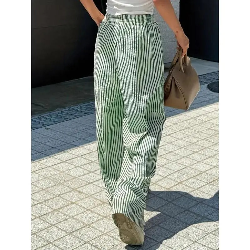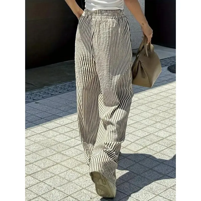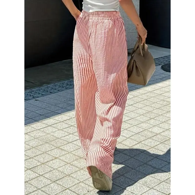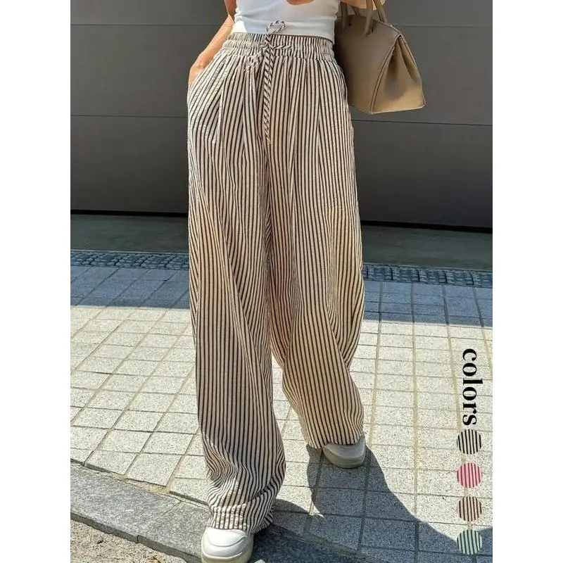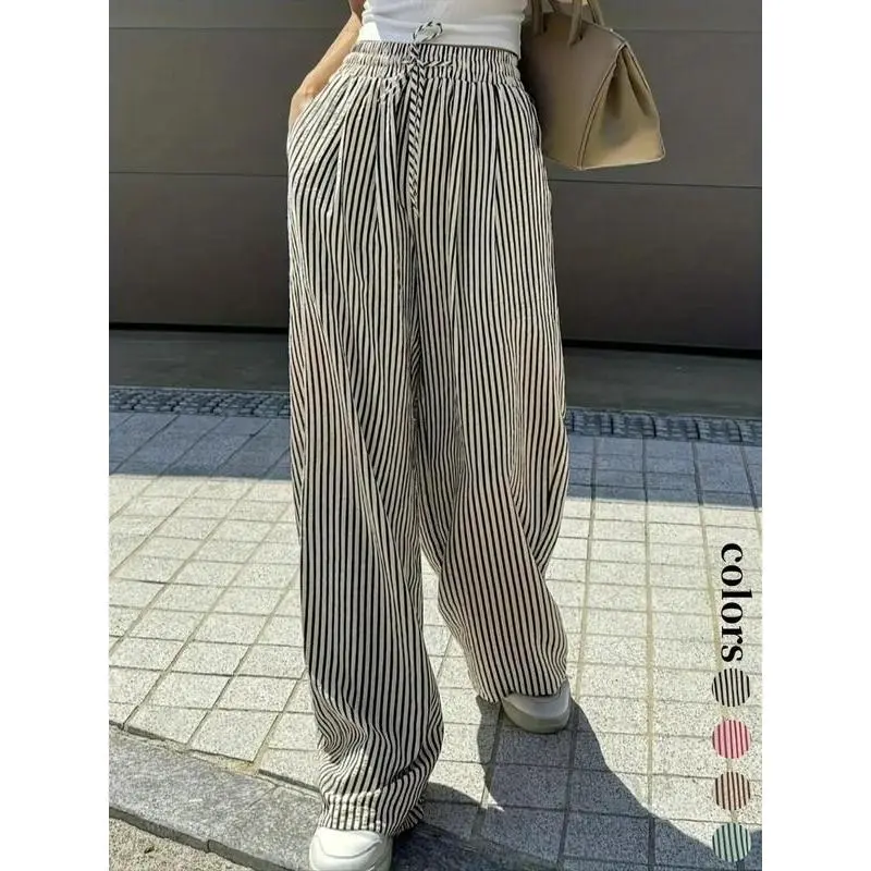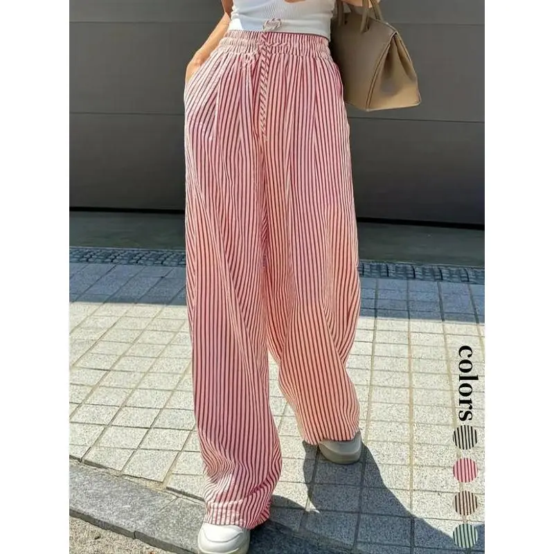 Trendy Women's Casual Wide Leg Pants with Elastic Drawstring Waist, Loose Fit Striped Straight Leg Trousers for Stylish Comfort