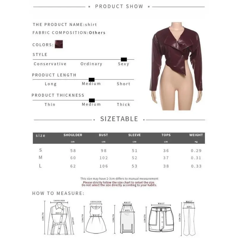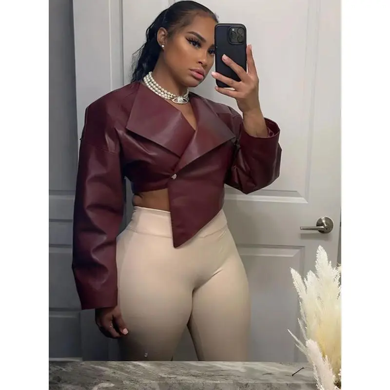 Women's Faux Leather Single Button Cross Neck Full Sleeve Crop Jacket for Autumn Streetwear
