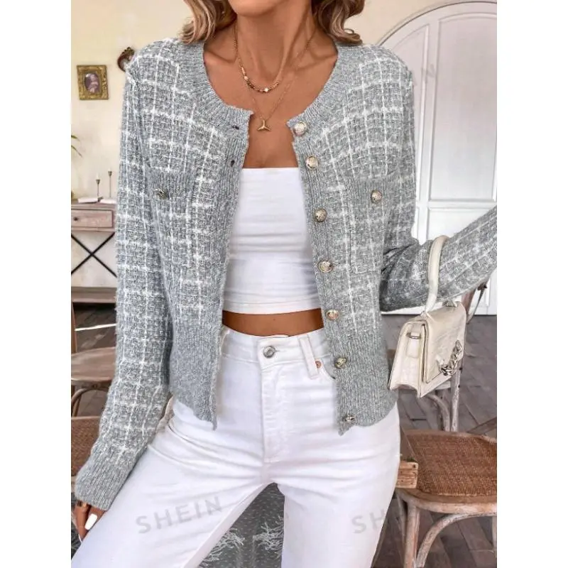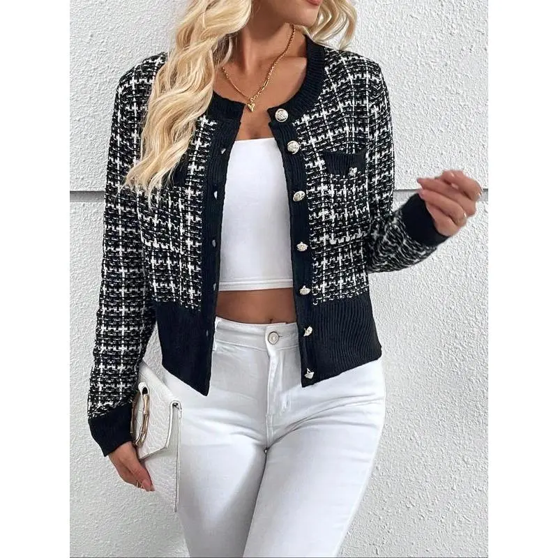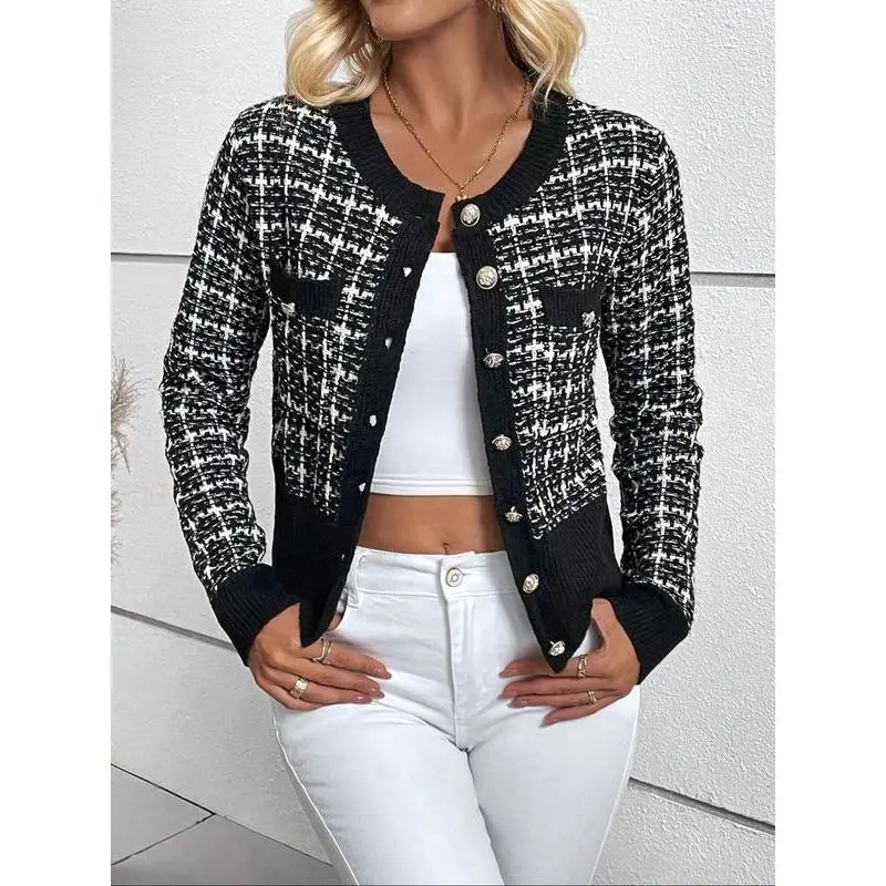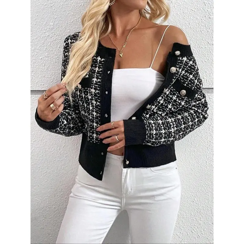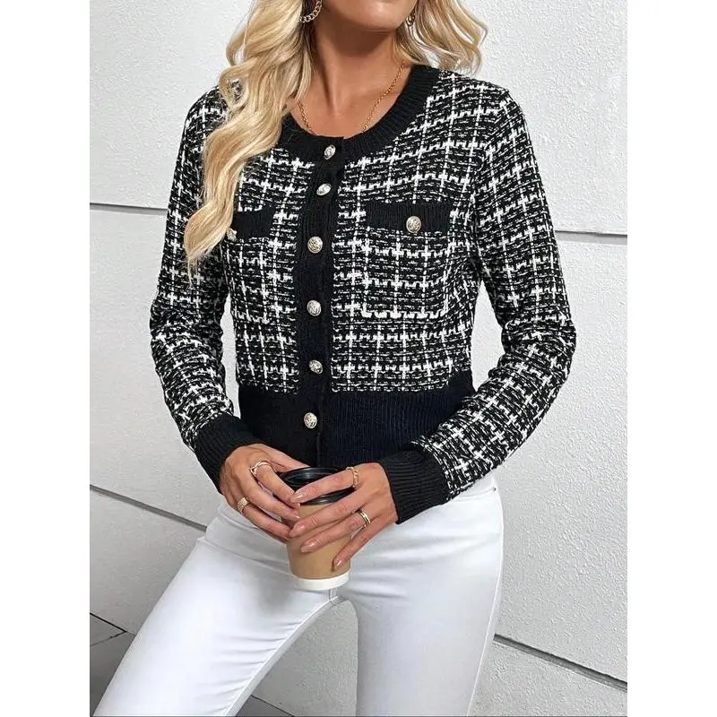 ��Wool Blend Fabric��: Crafted from a moderate thickness wool blend, providing warmth for the fall and winter seasons. ��Checked Pattern��: Features a unique check design that sets it apart from other cardigans in the market. ��Fitted Silhouette��: Designed with a fitted cut which accentuates the body shape while maintaining a comfortable feel. ��Seasonal Versatility��: Designed specifically for fall and winter wear, ensuring that you stay cozy during cooler weather. ��Classic Cardigan Style��: A timeless cardigan style that blends traditional elements with modern flair, making it a staple piece.
