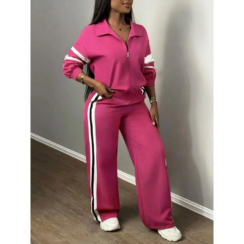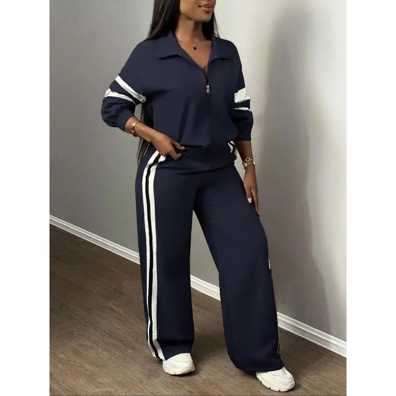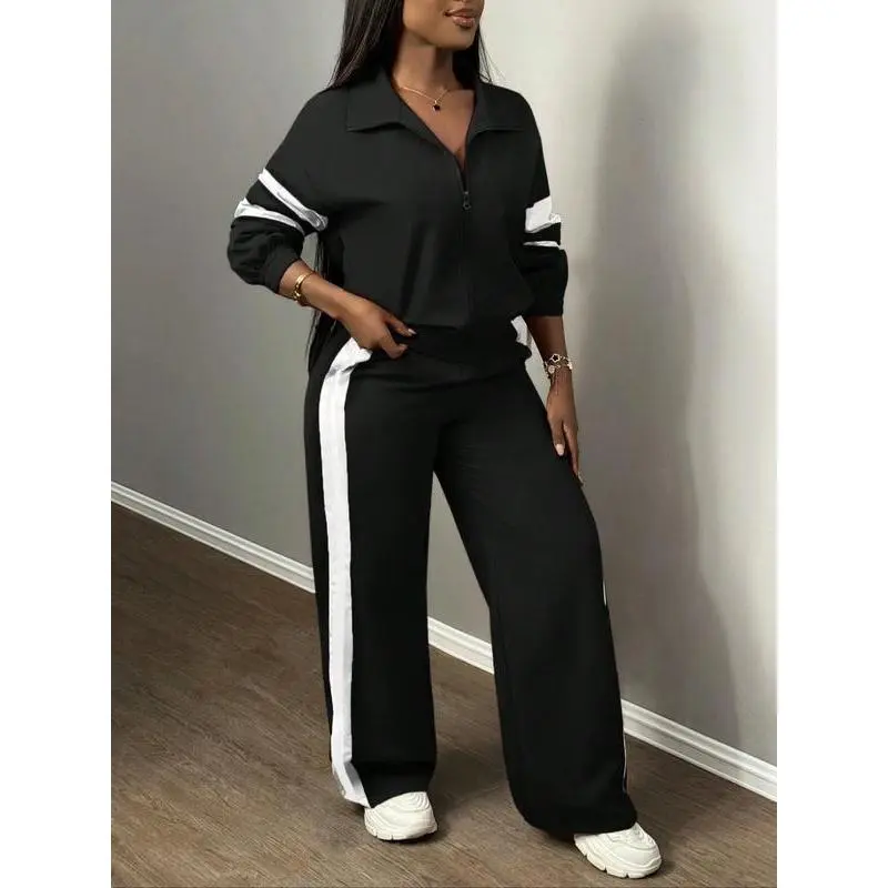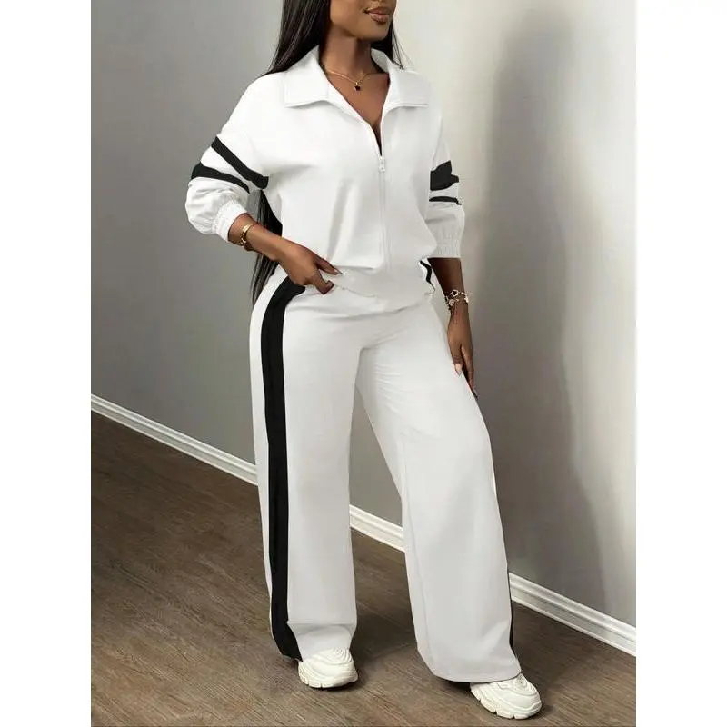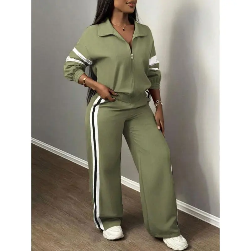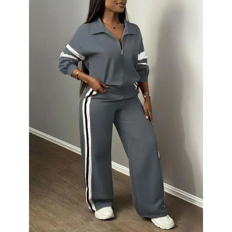 【Chic Two-Piece】: This set includes a zippered jacket and wide-leg pants, combining functionality with an updated street-ready look. 【Wide-Leg Pants】: The pants feature a loose cut that provides breathable movement, suitable for both leisurely walks and urban outings. 【Side Stripes】: Stripes along the sides enhance visual interest, adding a dynamic touch to the otherwise muted attire. 【Moderate Fabric Weight】: Crafted from moderate thickness material, it offers warmth and durability for the fall and winter seasons. 【Fitted Cut】: The fitted design of the jacket contouring the body ensures a flattering silhouette while maintaining ease of movement.