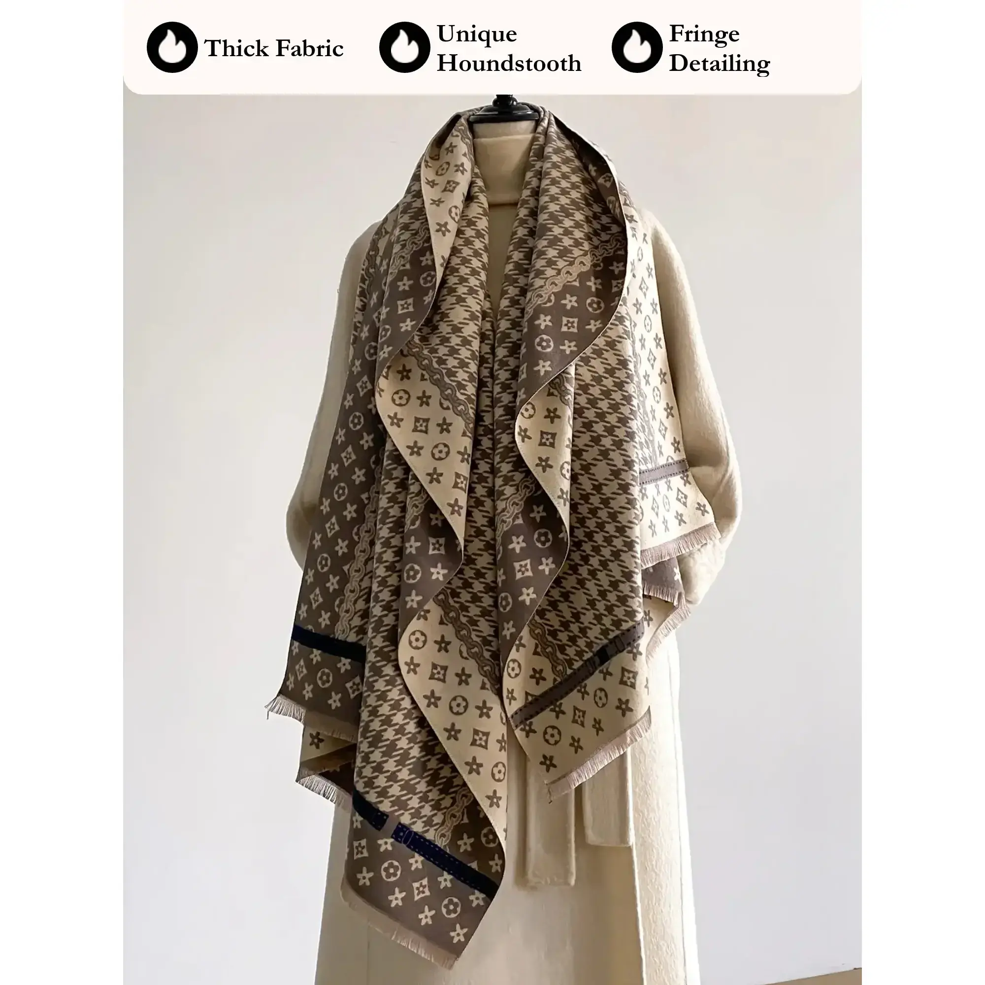 【Thick Fabric】: Constructed with a thick woven fabric, providing additional warmth and durability for fall and winter. 【Unique Houndstooth】: Featuring a classic houndstooth pattern, this scarf presents a timeless style that distinguishes it from others. 【Fringe Detailing】: Adorned with stylish fringe edges, this scarf adds a touch of sophistication to its overall appearance. 【Fitted Cut】: Designed with a fitted silhouette that hugs the shape, ensuring it stays in place while being worn. 【Seasonal Utility】: Specifically crafted for fall and winter, making it an essential accessory for colder weather.