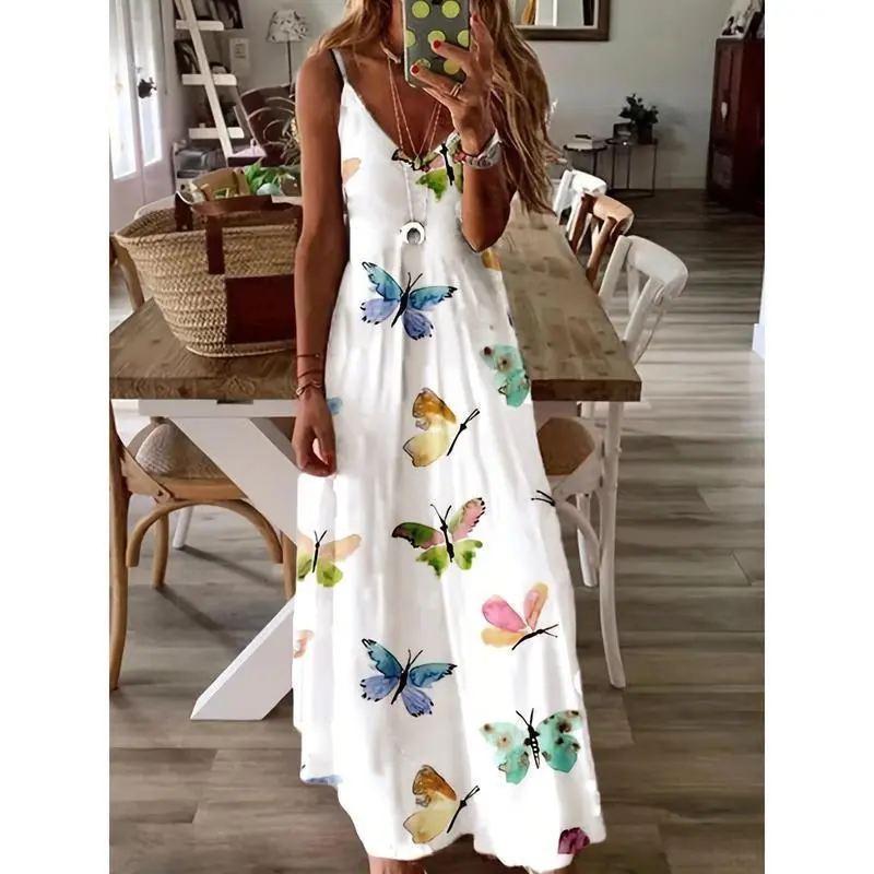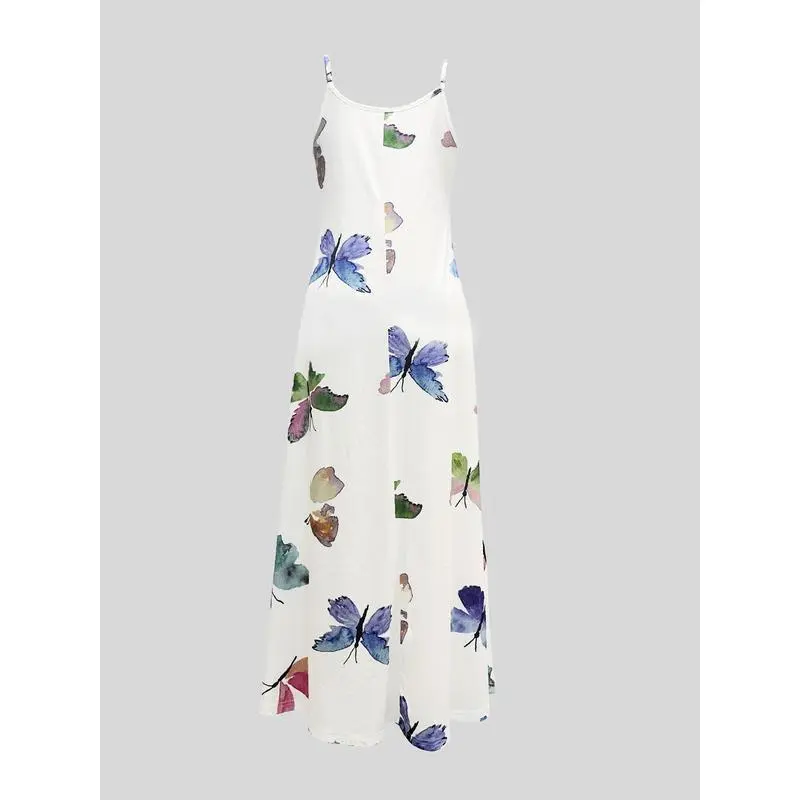 Women's Casual V-Neck Sleeveless Maxi Dress with Colorful Butterfly Print - Lightweight Semi-Sheer Stretchy Fabric, All-Season Vacation & Beachwear, Machine Washable