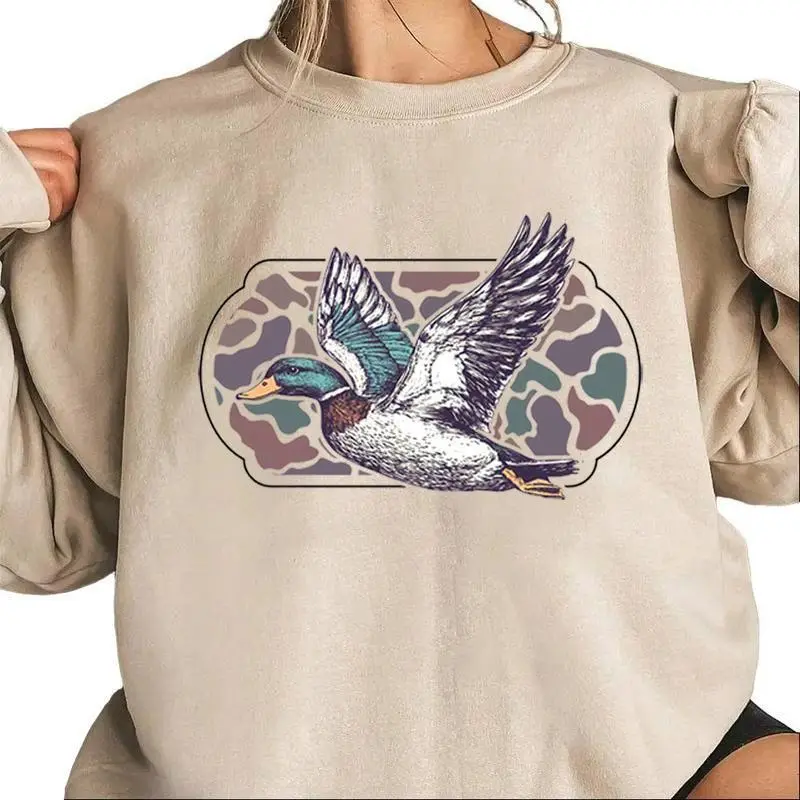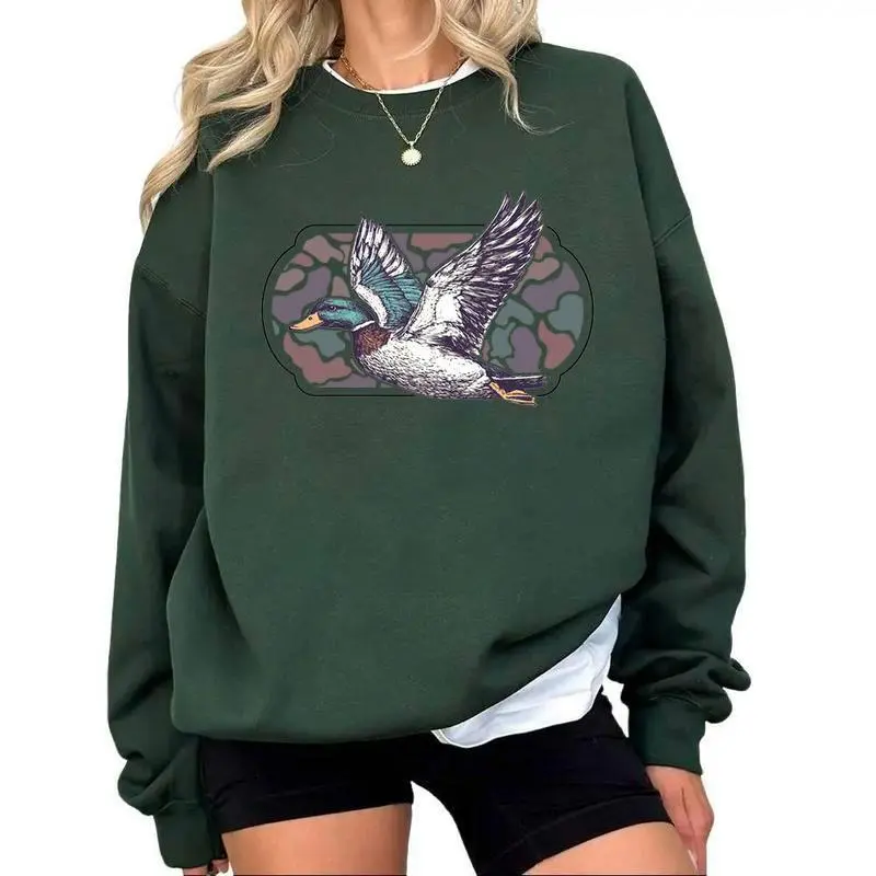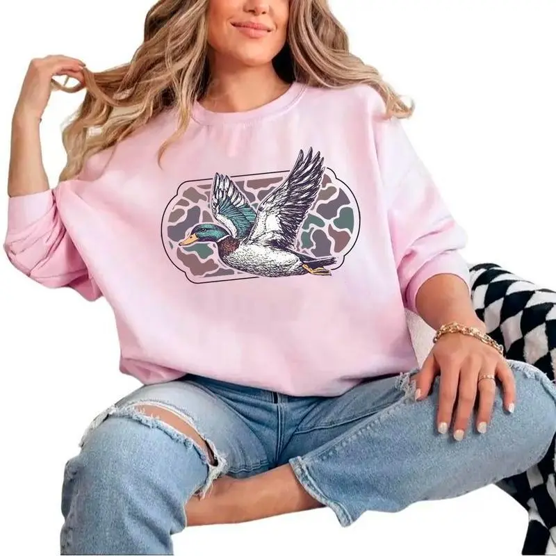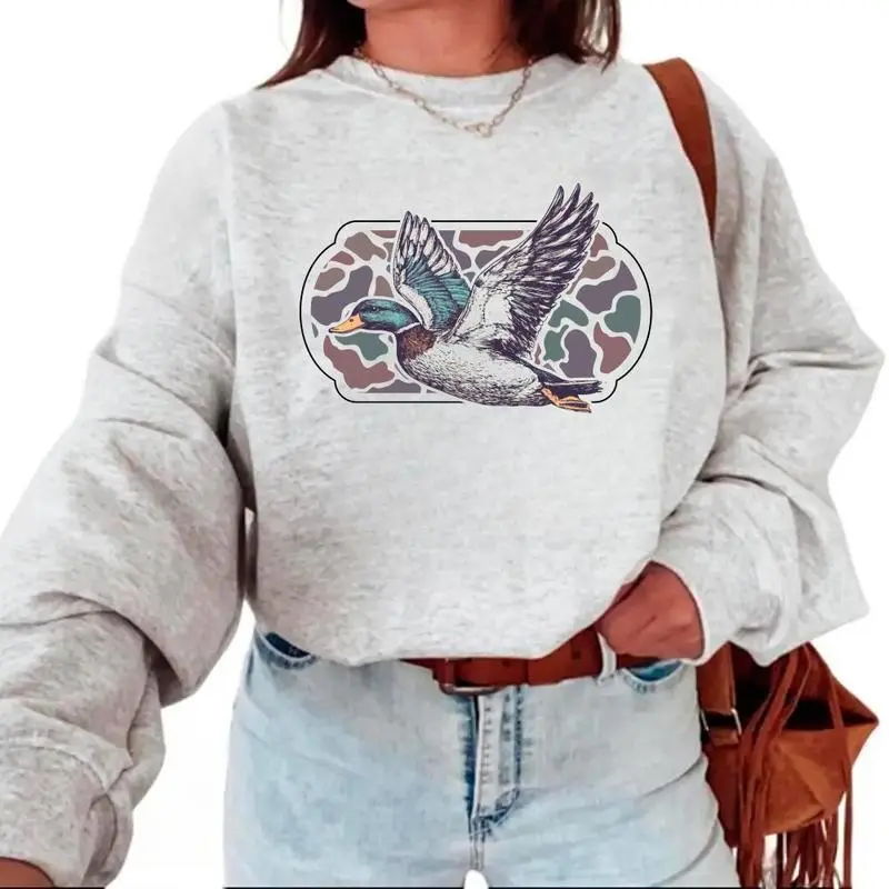 (Sale Off Up To 50%) Camo Flying Mallard Bird Old School Camo Vintage Crewneck, T-shirt, Cotton Hoodie Sweatshirts Womenswear Day Love Polyester Tops, Full Color, For Men, For Women, Casual, Classic Fashion, Tee Print