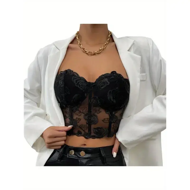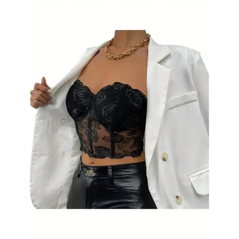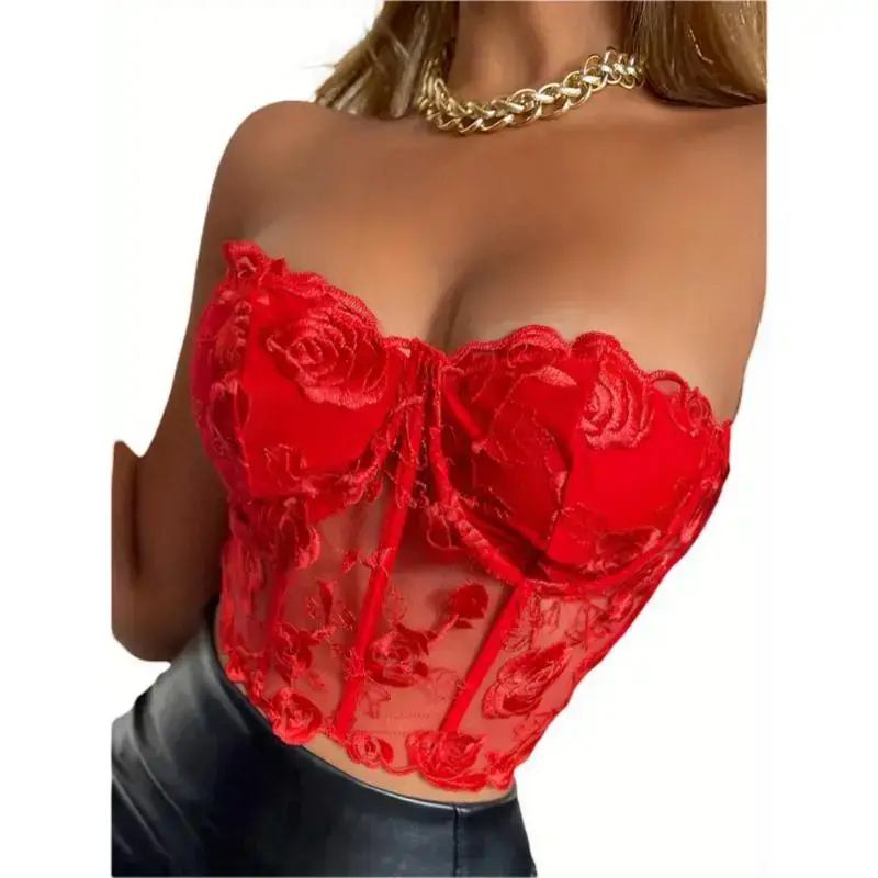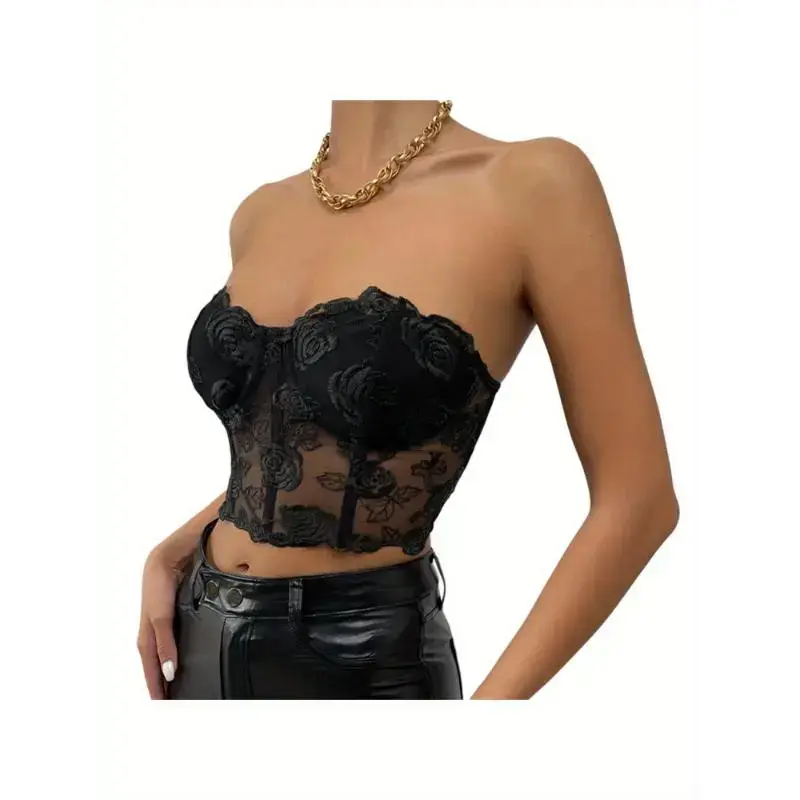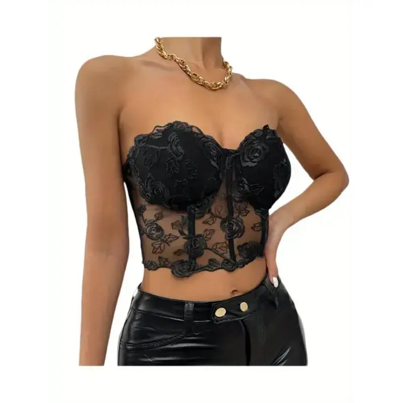 Womens Bustier Tube Tops Embroidery Flower See Through Off Shoulder Tank Tops for Daily Club Party Fabric Polyester Womenswear Collar Comfort Floral Sexy Black Short Skinny Sleeveless Slim